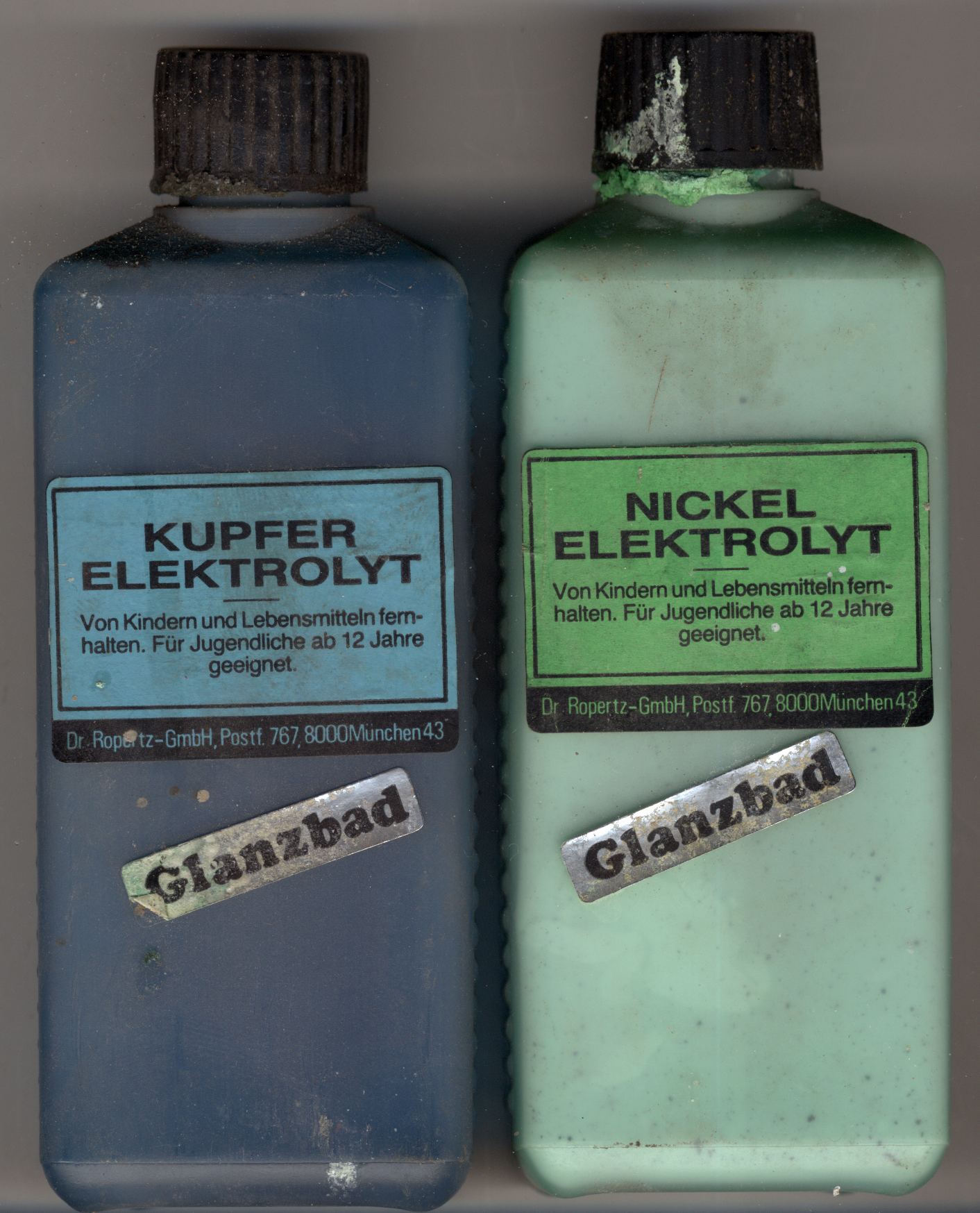 Ich habe mal im Keller nachgeschaut. Die beiden Galvaniklösungen muss mein Bruder mal gekauft haben, ich habe keine Erinnerung daran. Die vierstellige Postleitzahl spricht für ein hohes Alter, und gut verschlossene Flaschen. https://de.wikipedia.org/wiki/Postleitzahl_(Deutschland) also vor 1993 Ob die Firma noch existiert? kurz gesucht: Dr. Ropertz GmbH im ORTLINDESTR. 19, München, Bayern 81927, Bayern Löschung von Amts wegen 15.06.2022 kann aber auch ein Immobilienhändler gewesen sein, jedenfalls scheint sie nicht mehr zu existieren.