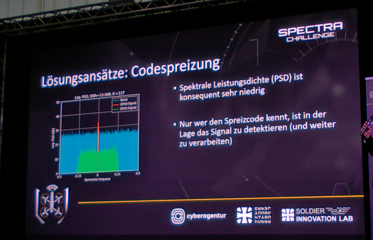 Die ACTRANS Gmbh setzt zwecks Verschleierung der zwischen Drohne und Basisstation ausgetauschten Daten auf Codespreizung. Für eine Person, die den eigentlichen Code nicht besitzt, ist das Signal „im Rauschen verschwunden“ und nur schwer zu orten.
