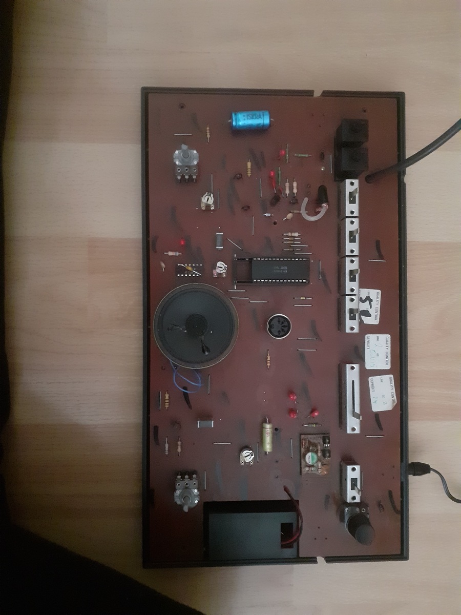 Das schwarzweiße TV Uraltspiel liefert ein schlechtes Bild auf Kanal 4. Der Kanal wird mit dem Poti oben rechts eingestellt. Das Kanalpoti kratzt ein bisschen. Die 50Hz habe ich mit dem Trimmer in der Nähe des Prozessors auf 50Hz eingestellt, waren vorher 51,7Hz. Dem HEF4011 und dem AY 3 8500 habe ich einen 100nF Keramikkond. verpasst. Erst waren die Schalter leicht oxidiert. Der blaue Elko hat nur 350 uF statt 1000 uF 10V mit normalen ESR Die Tantals (1uF bis 47uF) haben ihre Werte, nur kenne ich die ESR Werte nicht. Ein Tantal 10uF 16V koppelt das Bild auf die HF. Die Schlaufe beim Antennenkabel war so. Was könnte das sein ? Tantals habe ich keine zum Vergleich, den