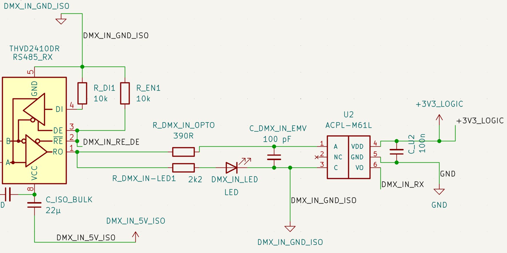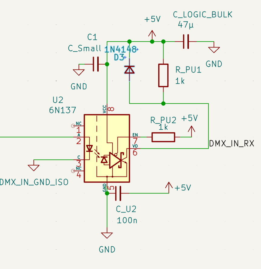 Bevor ich das Layout beginne, möchte ich gerne den Schaltplan der DMX-IN-Domäne von euch reviewen lassen. Was hier entworfen wird. Es handelt sich von den obigen Domänen (Logik, DMX-In, DMX-Out1, DMX-Out2) um die komplette DMX-IN-Signal- und Schutzstrecke, bestehend aus: XLR-Eingang mit PTC-Schutz (je Leitung) Common-mode choke 120-Ω Abschlusswiderstand TVS-Dioden pro Leitung gegen ISO-GND isoliertem RS485-Transceiver THVD2410DR Signal-Optokoppler 6N137 (Ausgangsseite → Logik-5-V-Domäne) galvanischer Trennung über Murata MEE1S0505SC vollständiger Abblock- und Bulk-Kondensator-Beschaltung sauber getrennten Massen: DMX_IN_GND_ISO (isolierte RX-Domäne) GND (Logik-/MCU-Seite) Die übrigen Baugruppen (MCU, OLED, Routing-Logik, DMX-OUT-Stufen, PSU etc.) sind in anderen Sheets und gehören nicht zu diesem Review. Um welchen Review ich bitte Ich möchte von euch gerne folgende Punkte überprüfen lassen: 1. Schutzbeschaltung DMX-Eingang PTC richtig dimensioniert / richtig platziert? Common-Mode-Choke korrekt in Serie? TVS-Dioden sinnvoll so platziert? 120-Ω-Terminierung korrekt eingebaut? 2. THVD2410DR Beschaltung Pin-Belegung korrekt? Pull-Downs für DI / DE+RE ok? Ist die Abblockung ausreichend? Passt der Bulk-Elko an 5V_ISO hier? Gibt es bessere Werte oder Positionen? 3. DC/DC-Wandler MEE1S0505SC Richtig beschaltet (Ein-/Ausgang)? Anzahl/Auswahl der Ein-/Ausgangskondensatoren sinnvoll? Potentialtrennung korrekt umgesetzt? 4. 6N137-Ausgangsstufe Richtige Ansteuerung des Optokopplers? Pull-Up sinnvoll dimensioniert (10k)? Entkopplung an Vcc ausreichend? 5. GND-Handling Trennung DMX-GND_ISO vs. LOGIC-GND korrekt? TVS gegen richtige Masse geschaltet? Optionaler RC-Link zwischen den Massen empfehlenswert? 6. Allgemeine Robustheit Gibt es offensichtliche Fehler im Signalfluss? Verbesserungsvorschläge zur EMV-Festigkeit? Sonstige „Fallstricke“ bei DMX-Inputs?