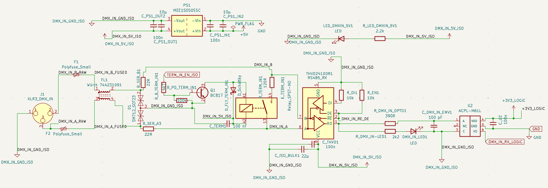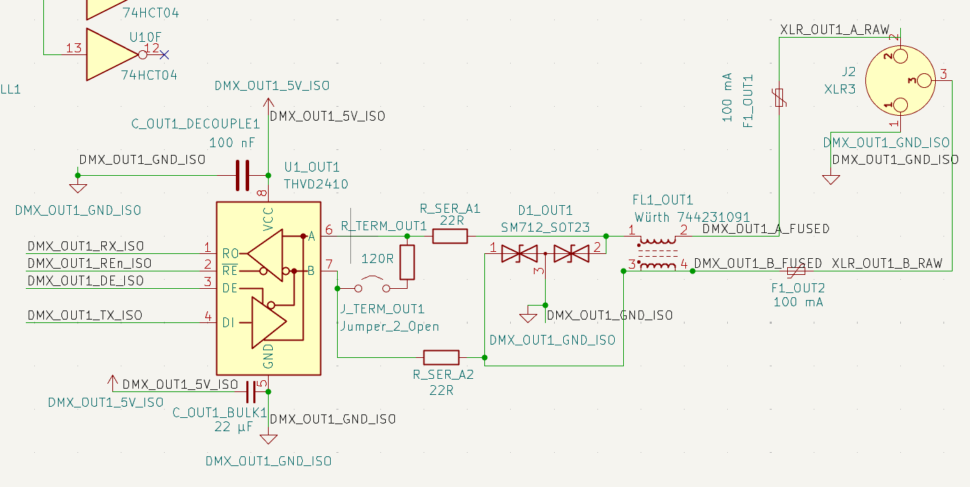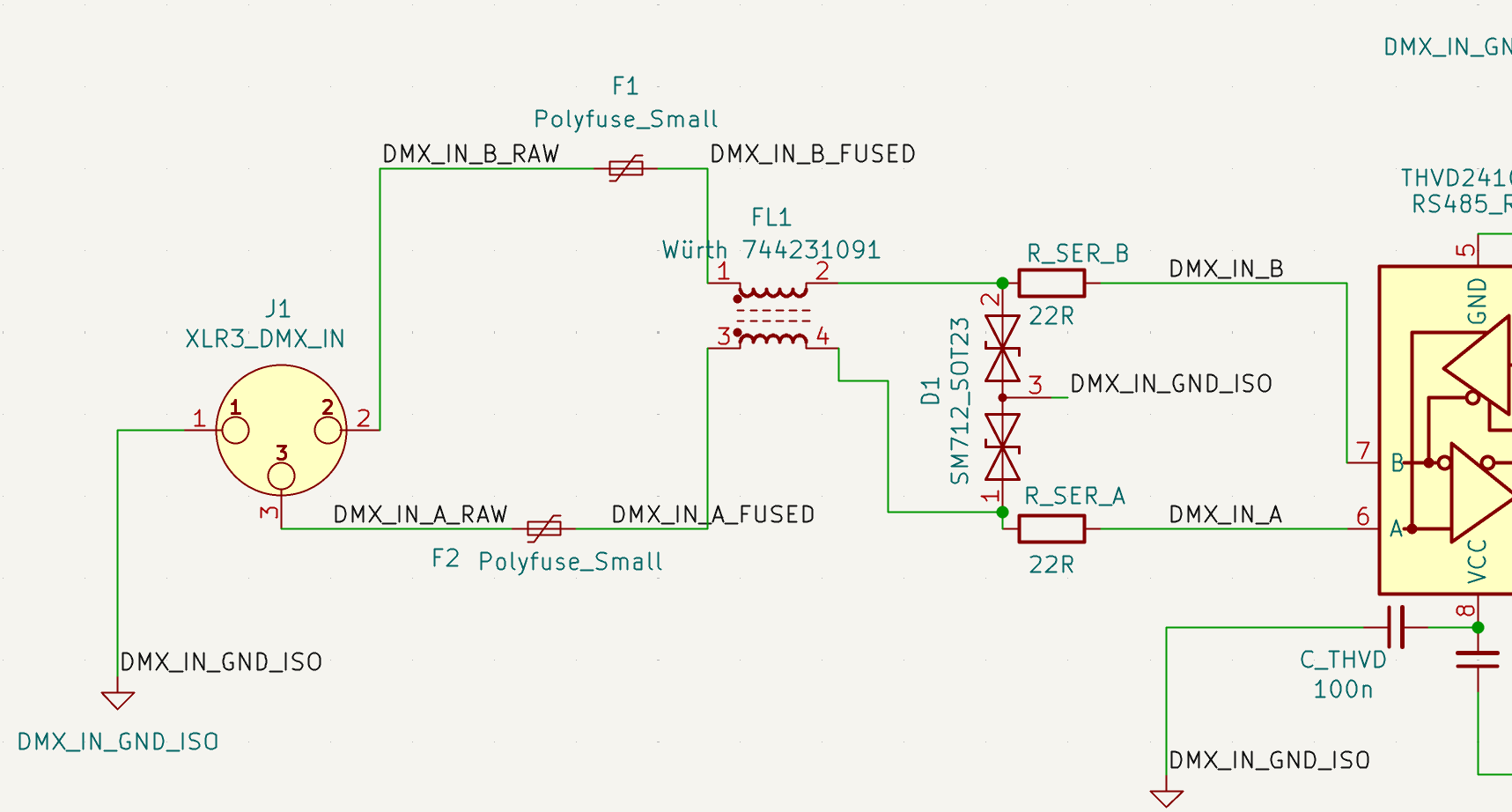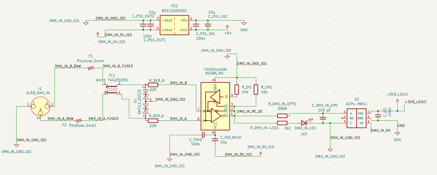 Herzlichen Glückwunsch, wenn der Optokoppler durchschaltet, schließt du deine 5V kurz. Stefan schrieb: > XLR-Eingang mit PTC-Schutz (je Leitung) Unnötig. Stefan schrieb: > Common-mode choke Unnötig. Stefan schrieb: > TVS-Dioden pro Leitung gegen ISO-GND Wenn du lustig bist, kannst du eine SM712 nehmen, da sind zwei bidirektionale TVS-Dioden drin und die ist genau für RS485 gedacht. Ansonsten sind zwei einzelne Dioden natürlich auch okay. Stefan schrieb: > isoliertem RS485-Transceiver THVD2410DR Der ist zwar nicht isoliert, aber definitiv robust genug, als dass du dir die Stroko und die PTCs schenken kannst. Was man noch machen kann, sind jeweils ein Serien-Widerstand von ~47R in die Datenleitung und B einen Pulldown und A einen Pullup spendieren, damit es bei nicht angeschlossenem Signal einen definierten Buszustand gibt. Stefan schrieb: > 1. Schutzbeschaltung DMX-Eingang > PTC richtig dimensioniert / richtig platziert? > Common-Mode-Choke korrekt in Serie? > TVS-Dioden sinnvoll so platziert? > 120-Ω-Terminierung korrekt eingebaut? Ich denke, niemand wird hier all deine Fragen beantworten. Denk ganz scharf selber nach und schau in ein paar Tagen noch einmal drauf und versuche zu verstehen, was du dir bei den jeweiligen Bauteilen gedacht hast. Und: Fehler sind normal. Irgendwann wirst du Leiterplatten bestellen und bei der Inbetriebnahme selber lernen, was du falsch gemacht hast. Das prägt mehr und ist hilfreicher, als wenn wir dir alles vorkauen. Ich habe dir noch einmal einen Screenshot von einem meiner aktuellen Projekte angehängt. In der Praxis habe ich mit der "Schutzbeschaltung" gute Erfahrungen gemacht und auch andere, kommerzielle Produkte machen nicht wirklich mehr.