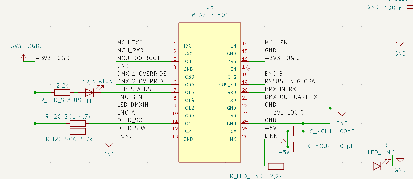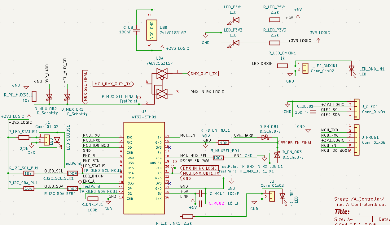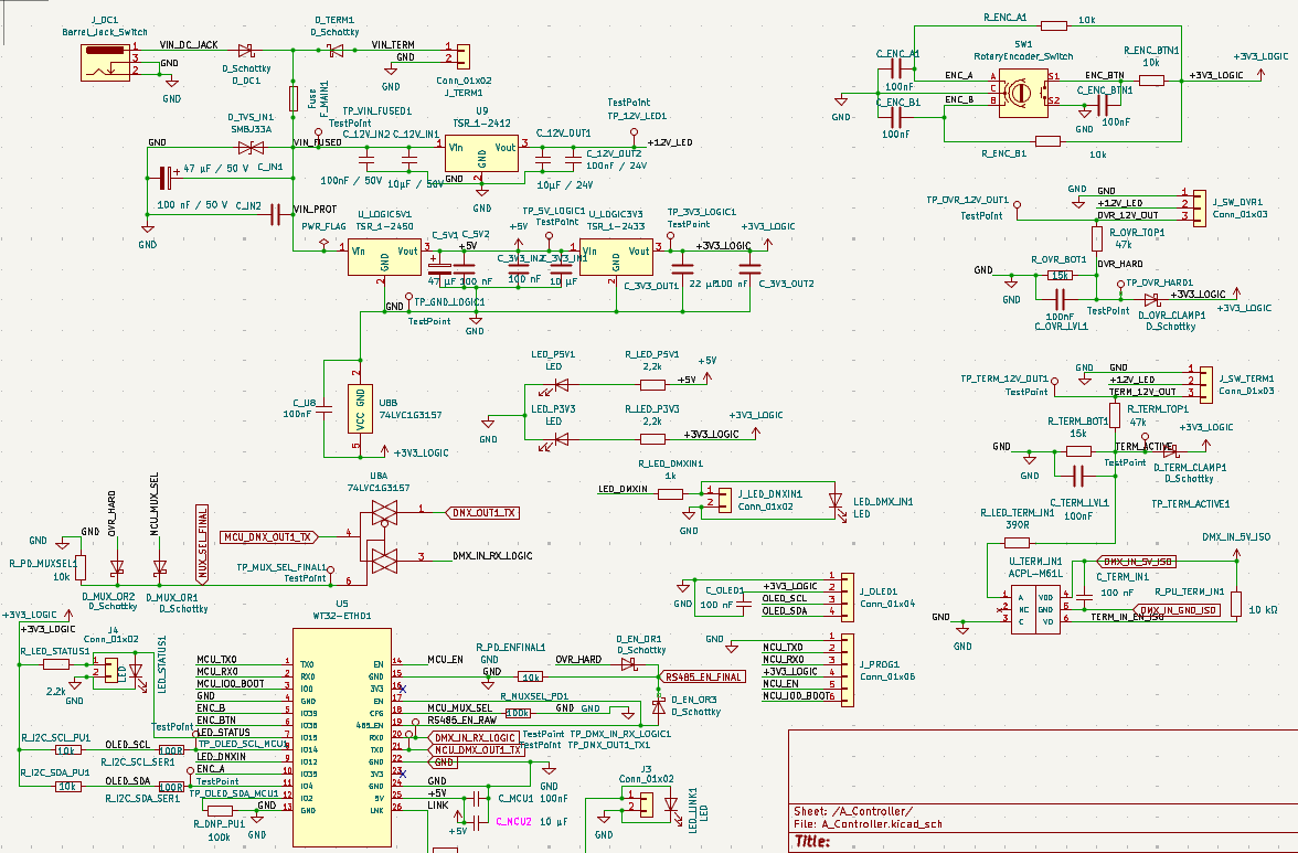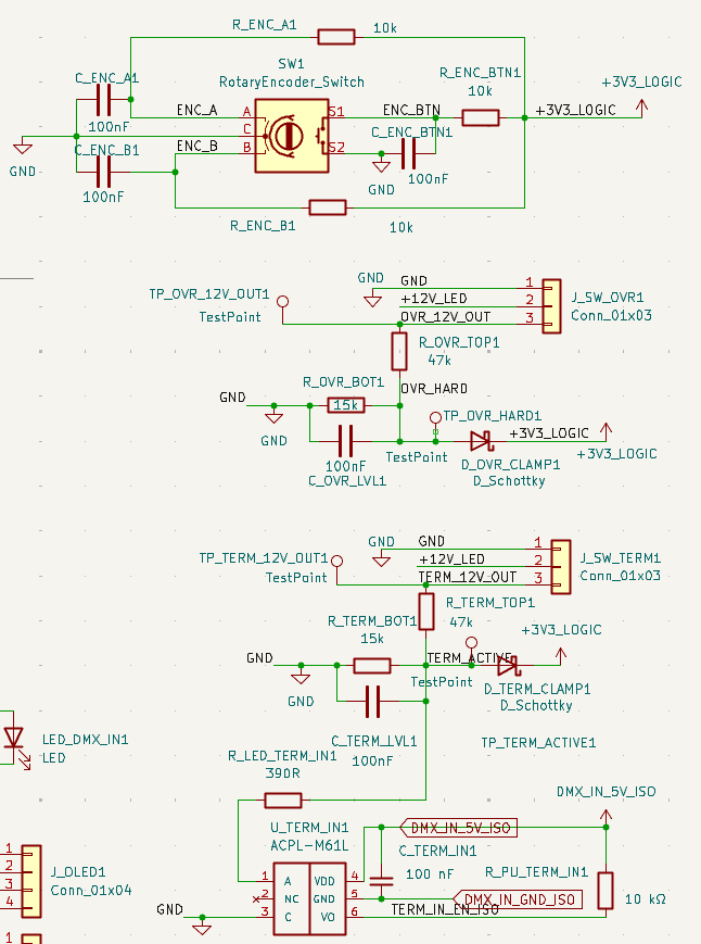 Vielen Dank erstmal für das gute Feedback. Ich bin schon dabei, alles verlinkte und geschriebene zu verarbeiten. Und ja, es soll durchaus die roadtaugliche Stabilversion sein - worst case wäre es, wenn mir aus dem DMX-Netz etwas ins IP-Netz durchschlägt. Daher sind alle Empfehlungen zu besseren Komponenten immer gerne gesehen. Ich muss leider wirklich alles absichern, was absicherbar ist, es ist zwar ein durchgehendes PCB aber auch von den Anschlüssen her strikt in die Zonen getrennt. Weil der THVD2410 schon einiges integriert, würde ich: - PTC auf der DMX-Leitung beibehalten (gegen hartes Fremd-24 V oder versehentlich 48 V über Stage-Kabel). - CMC / Gleichtaktdrossel beibehalten (gegen HF-Müll auf langen Leitungen). - TVS verkleinern und als „freundliche“ TVS mit etwas höherer Klemmspannung drin lassen – als Entlastung für den internen Schutz. - Snubber (120 Ω + 10 nF) würde ich drinlassen? Also Danke für den Hinweis, es entledigt mich der Pflicht die externe Schutzbeschaltung bis aufs Blut zu optimieren – der THVD2410 (ohne V) fängt viel ab. Hat jemand dieses http://www.digital-enlightenment.de/usbdmx.htm hier verlinkte Teil tatsächlich im Einsatz? Die Beschreibung ist hochinteressant, denn es beinhaltet wahrscheinlich genau das, was mich initial zu diesem Eigenbau bewogen hat, nämlich die per Kommando umschaltbare DMX-Weiterleitung oder eben ArtNet-Einspeisung, d.h. A) Kanal 1 = 0 dann leite DMX-Kanäle 11-25 weiter B) Kanal 1 = 255 dann speise DMX-Kanäle 11-25 aus ArtNet In KiCad habe ich zunächst versucht einen Schaltplan zu bauen und klar, das werde ich weitermachen, ich bin ja wegen "Peer Review" da und dafür braucht man Material. Nur wäre es schade, wenn ich meine Anfängerfehler erst im letzten Schritt bemerke und dann jemand zurecht sagt: "Hättest Du mal früher gefragt". Dann fräse ich mich mal durch alles Lesematerial durch und versuche es nochmal mit KiCad.