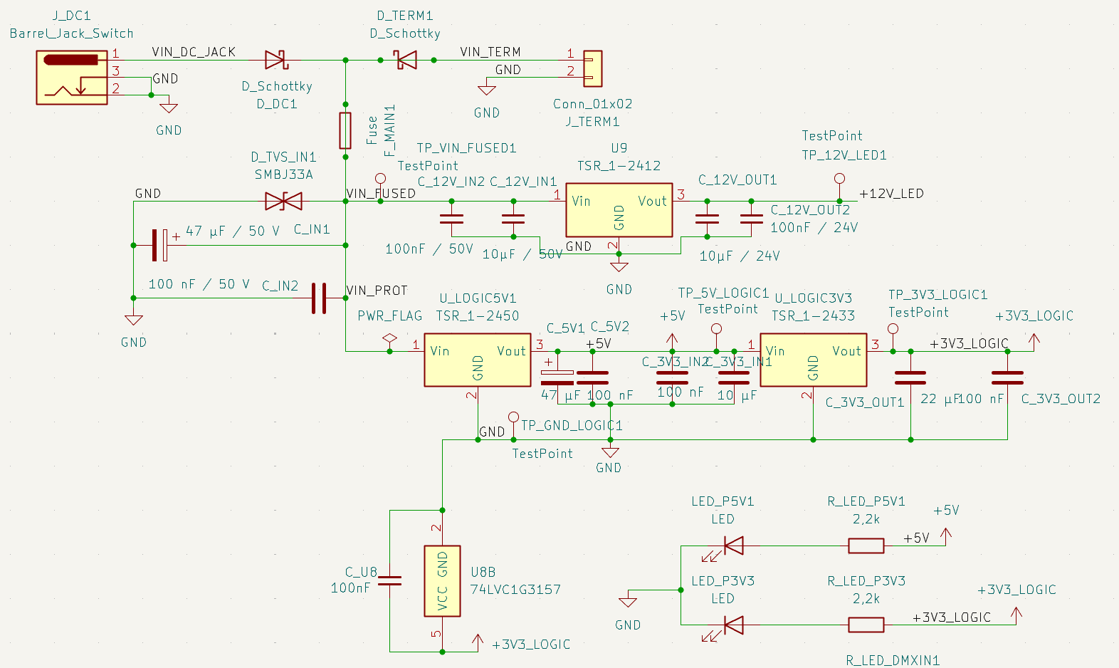 Hallo zusammen, ich arbeite aktuell an einem ArtNet-DMX-Node, der 2 galvanisch getrennte DMX-Ausgänge und 1 galvanisch getrennten DMX-Eingang besitzt. Das Ganze basiert auf einem von mir gerne genutzten WT32-ETH01 (ESP32 + Ethernet), soll aber von der Hardware her tourtauglich, störunempfindlich und elektrisch sauber getrennt aufgebaut sein. 1. Funktionales Ziel: - ArtNet per Ethernet empfangen - 1 DMX-Universum einlesen - 2 DMX-Universen ausgeben - Alle drei DMX-Ports vollständig galvanisch voneinander getrennt - Robuste Stromversorgung für 9–24 V - RDM-fähig 2. Technische Umsetzung - WT32-ETH01 als Logik - DMX-IN: MAX3082 + 6N137 + DC/DC 5→5 V - DMX-OUT1/OUT2: je eigener MAX3082 + 6N137 + DC/DC - Komplett isolierte Domänen: LOGIK, DMX-IN, DMX-OUT1, DMX-OUT2 3. Sicherheit & Schutzkonzept Eingangsseitig: - Barrel-Jack + Schraubklemme - PTC-Fuse - TVS-Diode - P-MOSFET Reverse-Polarity-Schutz - LC-Filter - Step-Down-Modul (R-78B-5.0 oder TSR-1-2450) → +5V_A - Drei isolierte DC/DC-Module → +5V_B / +5V_C1 / +5V_C2 RS485: jeweils PTC, TVS, CMC, Snubber. Optokoppler-Trennung mit 6N137. 6 mm Abstand / Isolationsschlitze zwischen den Domänen 4. BOM (gekürzt) - WT32-ETH01 - 3× DC/DC 5→5 V (NME0505SC o. ä.) - Step-Down TSR-1 / R-78B - 3× MAX3082 / SN75176 - 3× 6N137 - PTC, TVS, CMC, 120 Ω, 10 nF - Barrel-Jack + Schraubklemme - Hammond 1590D / geschirmtes Polycase DIN-Rail - Display 1,3" I²C OLED, SH1106/SSD1306-kompatibel, 128×64, 3,3 V - Drehencoder (z. B. Bourns PEC11 / „KY-040“-kompatibel) - LEDs, Taster, Kleinteile 5. Platinenlayout - 160×100 mm - Links DMX-IN, rechts DMX-OUT1/2, Mitte Versorgung/Logic - DMX-Zonen strikt getrennt, je eigene 5-V-Insel - Isolation-Slots zwischen den Domänen - Differentialführung für DMX - CHASSIS getrennt von Logic GND Nun habe ich gestern den ganzen Abend mit KiCad verbracht und das Ergebnis war zum Heulen. Also würde ich, bevor ich mich mit Leiterbahnen verkünstel, erstmal die Profis fragen ob ich denn irgendwas komplett übersehen habe und/oder ob ich mir hier unnötige Mühe mache. Meine Frage an die Community: Gibt es ähnliche Projekte, von denen ihr wisst? Vielleicht sogar fertige Platinenlayouts oder Teilprojekte, die man vergleichen kann? Oder jemand, der schon einmal 2× isolierte DMX-Out + 1× isolierte DMX-In gebaut hat? Falls jemand eine ähnliche Platine „übrig“ hat, würde ich mich freuen.