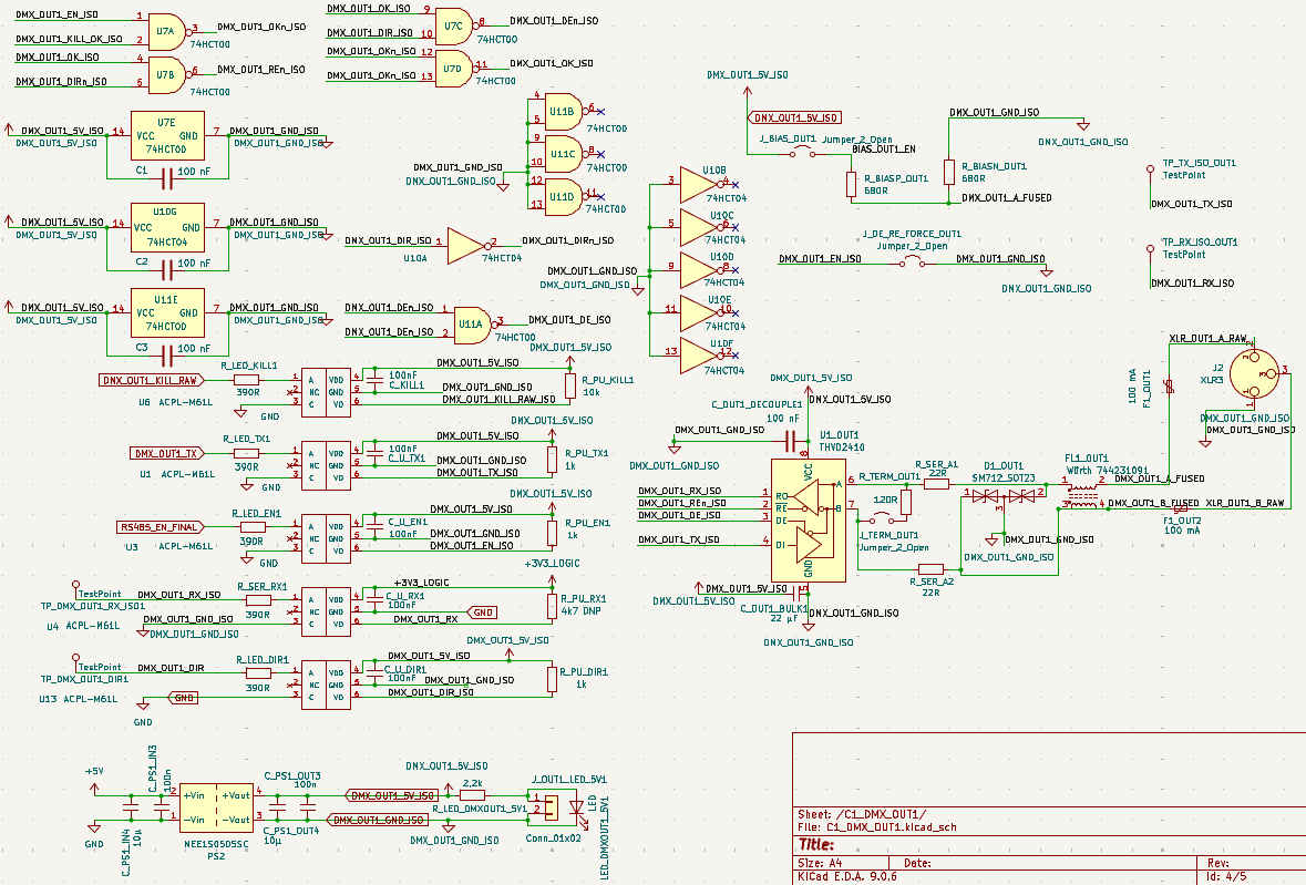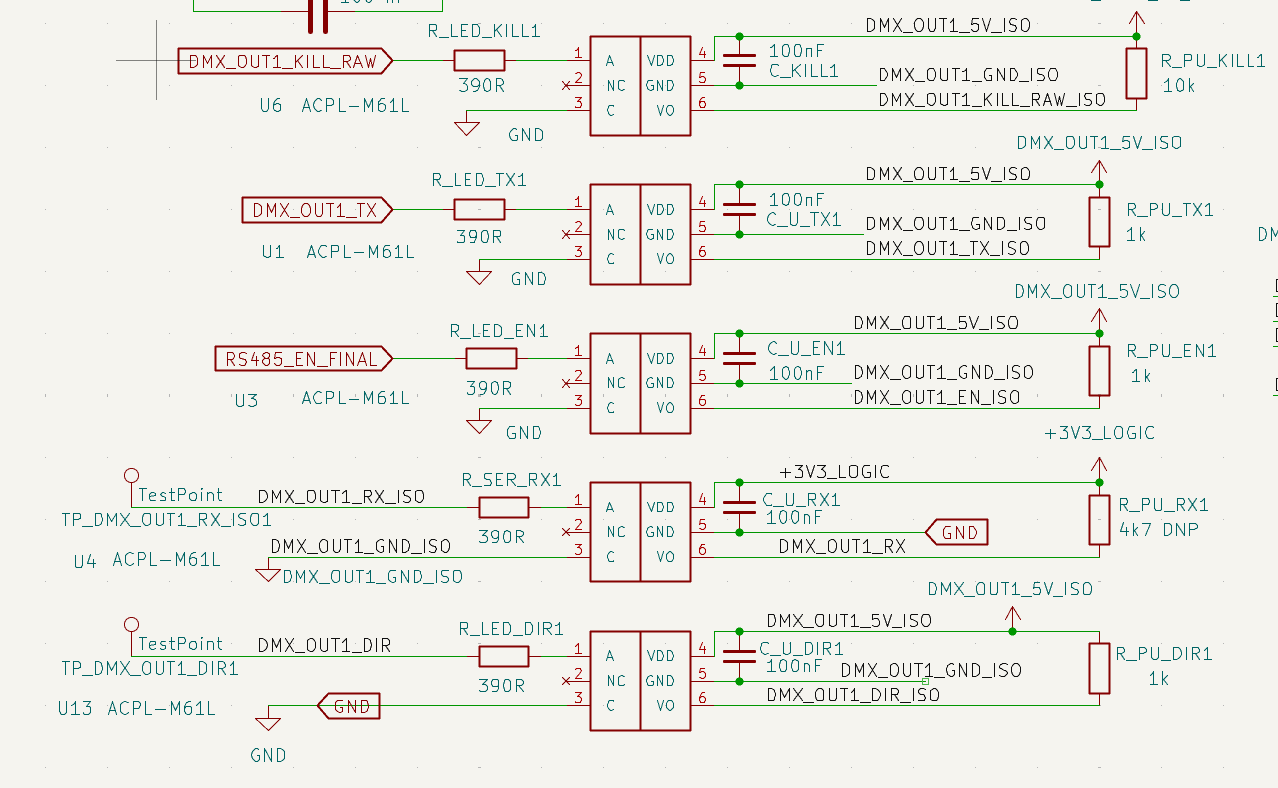 Jetzt die erste Ausgangsstufe, wie mir gesagt wurde von links nach rechts und die Isolierten Spannungen nur als Netlabels, nicht als KiCad-Symbol, damit es nicht beim Layout auf Regulär-GND geht, ich mach ja brav alles was mir gesagt wird. Damit es besser lesbar ist, sowohl als Übersicht und dann die Einzelblöche. Von oben nach unten: U1 = TX-Optokoppler (Logik → DMX-ISO-Side) U3 = EN-Optokoppler (Logik → DMX-ISO-Side) U4 = RX-Optokoppler (DMX-ISO-Side → Logik) Hier die Dateierklärungen, hoffentlich macht es die Ansicht einfacher: a: Ausgangsseite b: DC/DC c: Oben TX, drunter EN d: Links oben EN, links unten RX, rechts der 485-Chip e: Gesamtüberblick (teils etwas klein, daher vorher die Details) Hoffentlich habe ich alle Punkte umgesetzt, nochmal Danke dafür