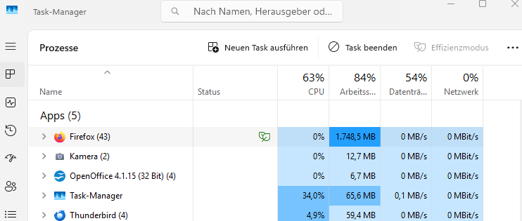 Mairian schrieb: > also genau jetzt, benötigt Brave schwankend zwischen 3Gb und 3,4GB, mit > 4GB wäre ich also bereits jetzt wieder im Schneckenmodus Mal einen anderen Browser getestet oder wenige Tabs aktiv?