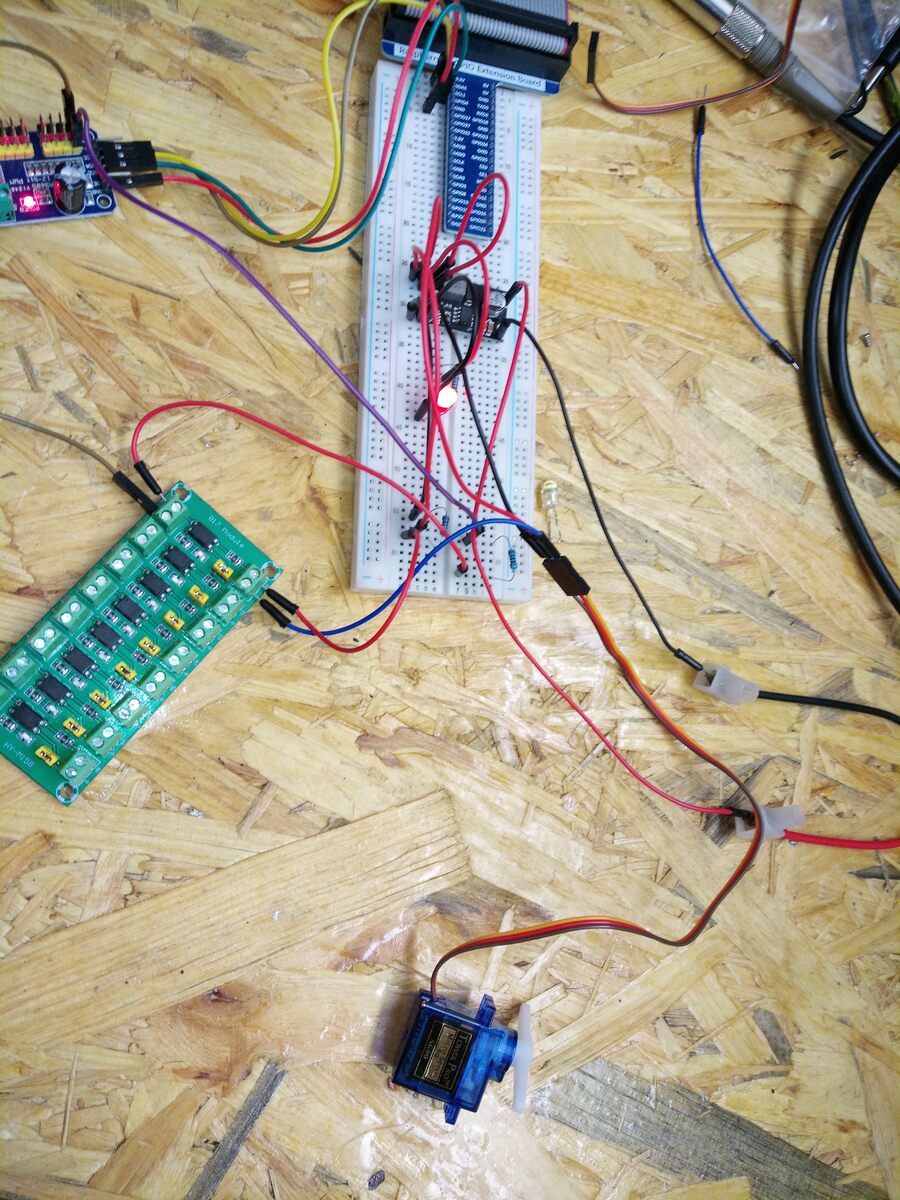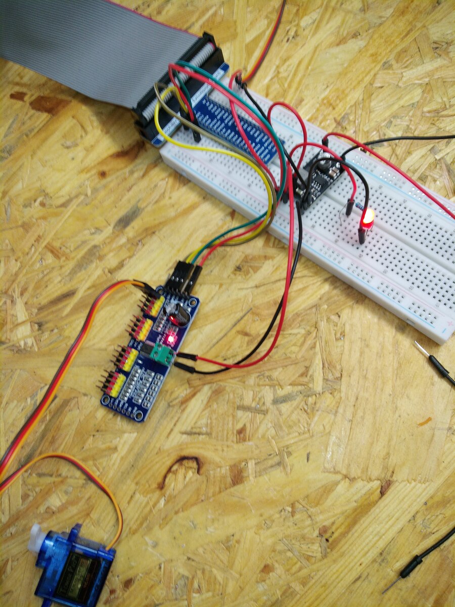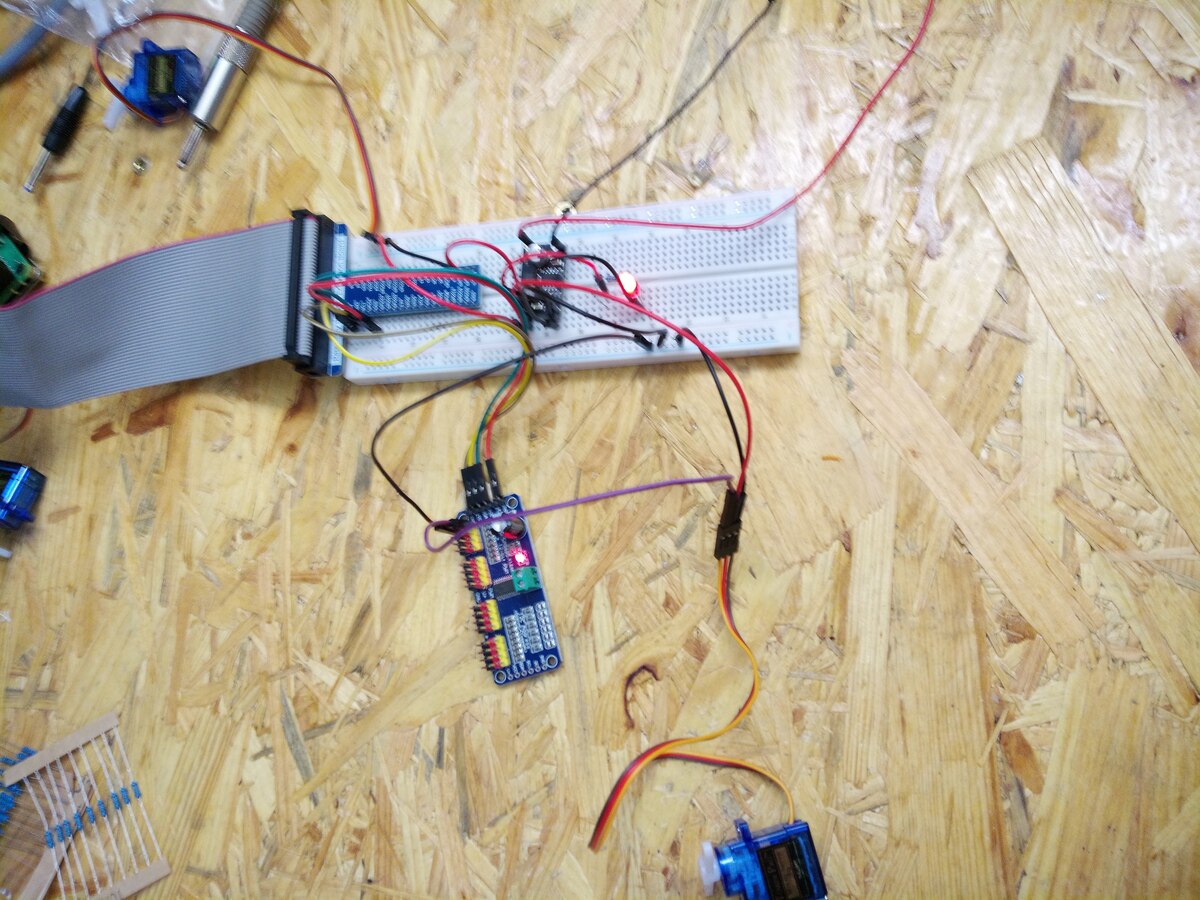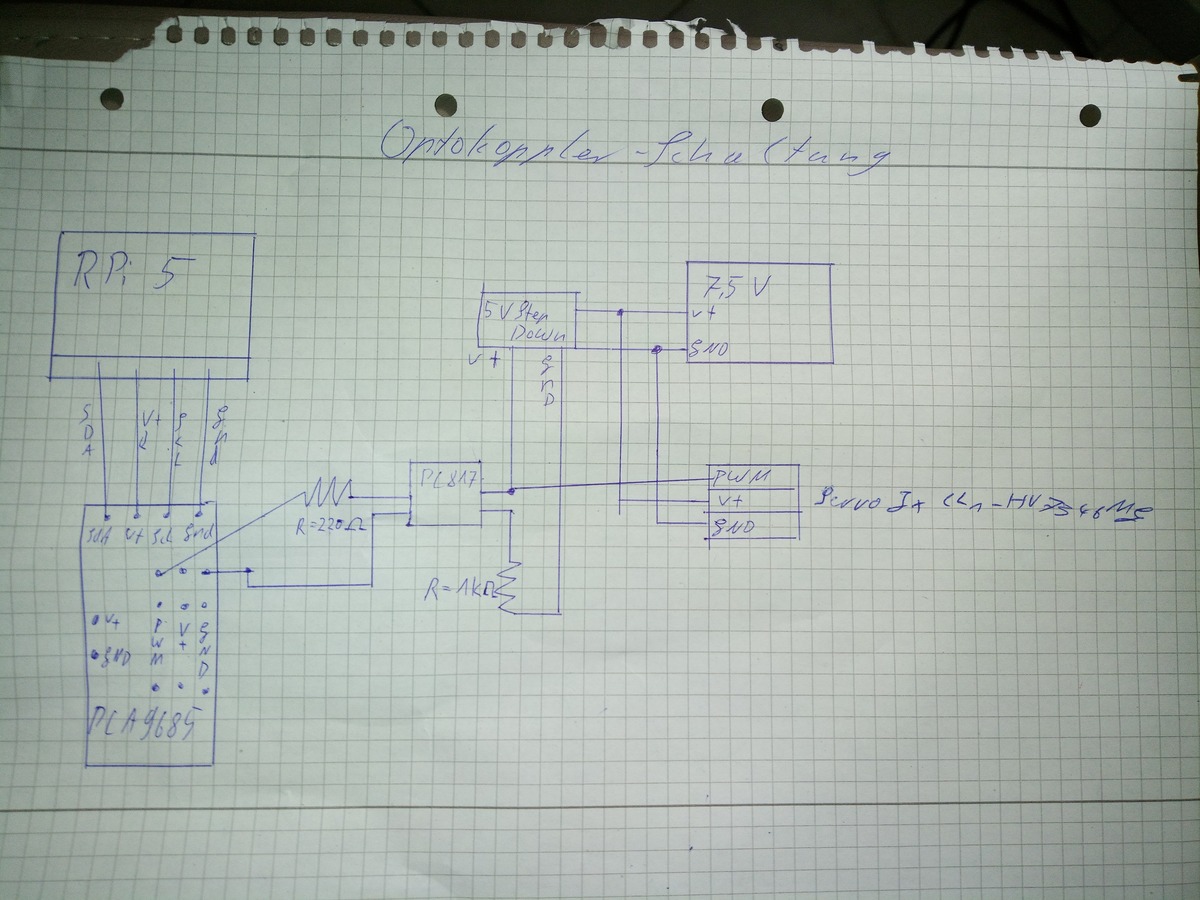 Hallo, glücklicher Weise habe ich heute später Schule. Konnte also noch dokumentierte Aufbauten machen. Folgend ein paar Fotos von meinem Aufbau und sehr schlechten Schaltplänen. Das 1. Foto zeigt den nicht funktionierenden Aufbau mit der fast Signalisolation per Optokoppler. Wobei auf dem Pc817 Modul die Masse sogar verbunden zu sein scheint und mir das Bezugspotenzial nicht zu fehlen scheint. Ab und an zuckt der Servo, folgt aber nicht den eigentlichen Befehlen. Sollte ich hier nochmal versuchen das Pwm nach dem Optokoppler mit einem Transistor zu verstärken? PS: Die Werte für Wiederstände usw. im Schaltplan ( solange diese in der Schaltung vorkommen) (Foto 5 +6) haben sich bei allen hier gezeigten Aufbauten nicht geändert. Foto 2: Hier ist zu sehen, dass ein pwm ankommt ( Die LED lässt sich mit dem Pwm betreiben) sobald ich das Pwm vor dem Optokoppler kappe, geht sie aus. Foto 3: Hier der funktionierende simpelste Aufbau: Das PCA trägt den Laststrom des Servos und ich muss nur auf die dafür vorgesehenen Pins den Servoanschluss stecken. Dieser geht bei meinem großem Servo nicht ( killt wahrscheinlich wegen zu hohem Strombedarf mein PCA ), da würde bei geringer Störung der Leitung folgender Aufbau passieren: Foto 4: Dieser ist das selbe Prinzip und funktioniert mit meinen sg90 Servos einwandfrei. Hier ist eben nur der Laststrom des Servos nicht über das PCA geführt. PS: Bei meinem großem Servo würde ich natürlich keinen Laststrom über das Bradboard laufen lassen. Außerdem wäre ein Kondensator evtl. nötig, da ich diesen auf dem PCA habe und auf der jetzigen Schaltung nicht und meine ,, Stromanzeige-LED" (die momentan einzige der dicken LEDs auf dem Foto) durch den schnellen Bedarf an Strom des Servos zu flackern beginnt. Foto 5: Der Schaltplan für Bild 4 nur mit anderem Servo und folglich anderer Stromversorgung. Foto 6: Nicht funktionierende Optokoppler-Schaltung nur mit anderem Servo als in Bild 1 und folglich anderer Stromversorgung. Hoffe, damit ist etwas anzufangen. Liebe Grüße Finn