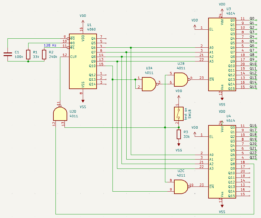 Hallo Ich bitte um Beurteilung einer Testanordnung für ein übergeordnetes System. Nach dem Schließen des Schalters im Zentrum, sollen die Ausgänge Q0 bis Q23 nacheinander für je eine Sekunde High werden. Diese steuern dann kleine N-Kanal MOSFETS 2N7000, aber das ist nebensächlich. Funktioniert die Logik, so dass das System jeweils mit Q0 startet? Stimmt der ein Sekunden Takt? Werden alle Ausgänge Low wenn der Schalter offen ist? Ja der CD4514 ist exotisch, aber vorhanden und für einmalige Anwendung gut.