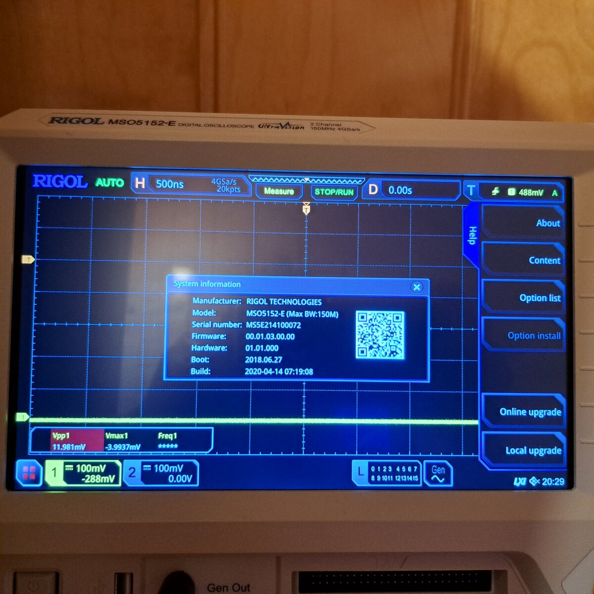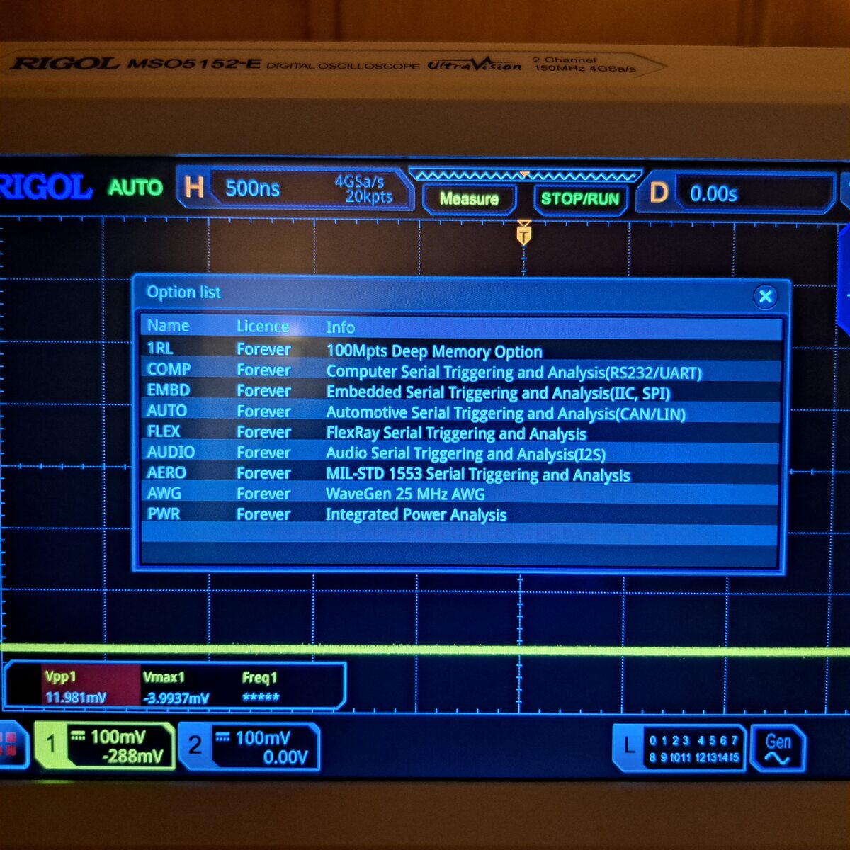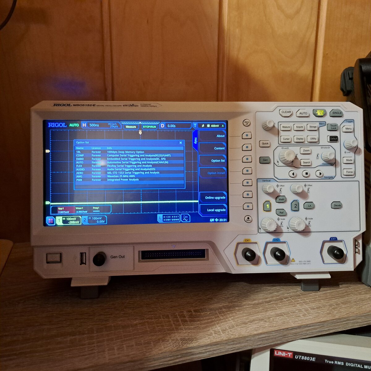 Verkaufe ein Rigol Oszilloskop vom Typ MSO5152-E, mit USB, LAN und HDMI Anschluss, 2 Kanal, alle Optionen sind frei geschaltet, siehe Bild, Bandbreite 150MHz, 4GSa/s Abtastrate, 100Mpts Speichertiefe, 22,9 cm Touch-Display mit einer Auflösung von 1024x768 Pixel. VB: 600 Euro