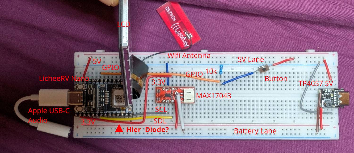 Hallo zusammen, ich habe ein kleines Problem mit einer Schaltung für meinen Audio Player. Bei der Breadboard-Schaltung auf dem Foto im Anhang habe ich zum Testen mal die 5V Lane oben rechts abgeklemmt und einen Akku angeschlossen, um die Ladefunktion des TP4057 (5V) zu testen. Ich war ein bisschen überrascht, als plötzlich das Display des LicheeRV flackernd aufgeleuchtet und das Teil gebootet hat. Das kann ich nur darauf zurück führen, dass der 3.3V VCC des MAX17043 ohne Spannungswandler direkt mit dem Anschluss für den Akku verbunden ist und der LicheeRV Nano auch über 3.3V betrieben werden kann - folglich lief der LicheeRV auf dem 3.3V Anschluss direkt mit der Akkuspannung von 3.7V. Der MAX17043 sollte laut Datenblatt mit 3.3V betrieben werden (nicht mit 5V). Da die Haupt-Schaltung durch den TP4057 mit 5V (oder genauer 5.1V) läuft, wollte ich den 3.3V Ausgang des LicheeRV nutzen, um den MAX17043 zu betreiben. Wenn der aber in beide Richtungen verbunden ist, dürfte das zum Problem werden. Ich habe also aus meiner Sicht 3 Optionen: 1.) Wenn der MAX17043 auch durch die Batterie mit Energie versorgt werden kann und nicht bei 3.1V ausfällt, kann ich einfach die 3.3V Leitung vom LicheeRV weglassen und habe eine funktionierende Schaltung 2.) Ich stelle die ganze Schaltung auf 3.3V Betrieb um und verwende statt des TP4057 mit 5V einen mit 4.15V (das sollte in der Toleranz von den 3.3V des LicheeRV und des MAX17043 liegen) - allerdings weiß ich dann nicht so recht, wie ich die verschiedenen Spannungen des Akkus, des Boosts und der Versorgungsspannung vom LicheeRV überein bringen soll. 3.) Ich füge an der 3.3V Leitung des LicheeRV eine Diode ein, die den Strom nur in Richtung des MAX17043, nicht aber zum LicheeRV hin fließen lässt. Hier ergibt sich dann das Problem, dass am Akku dann eine Spannung von 3.3V anliegt, diese aber gleichzeitig am Battery-Port vom TP4057 anliegt. Was dann passiert ist für mich undefiniert. Folglich kommt eigentlich nur die 1. in Frage.... Oder hat jemand noch eine bessere Lösung?