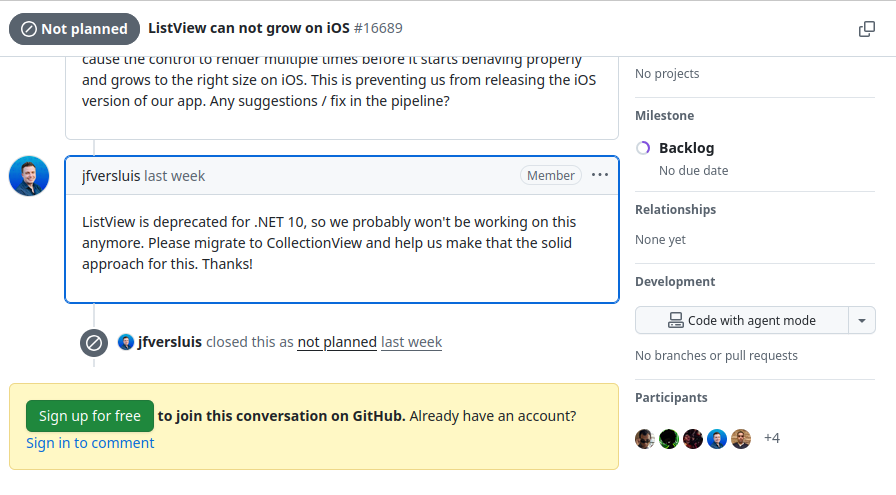 An Companion-Applikationen arbeitende Entwickler sollten berücksichtigen, dass es Microsoft mit der in MAUI 10 angekündigten „Depreciation“ des ListView-Steuerelements mehr als ernst meint. Die MAUI-Entwickler sind mittlerweile dazu übergegangen, als „valide“ bezeichnete Fehlerberichte gegen die ListView mit einem Hinweis, doch bitte die CollectionView zu verwenden, zu schließen.