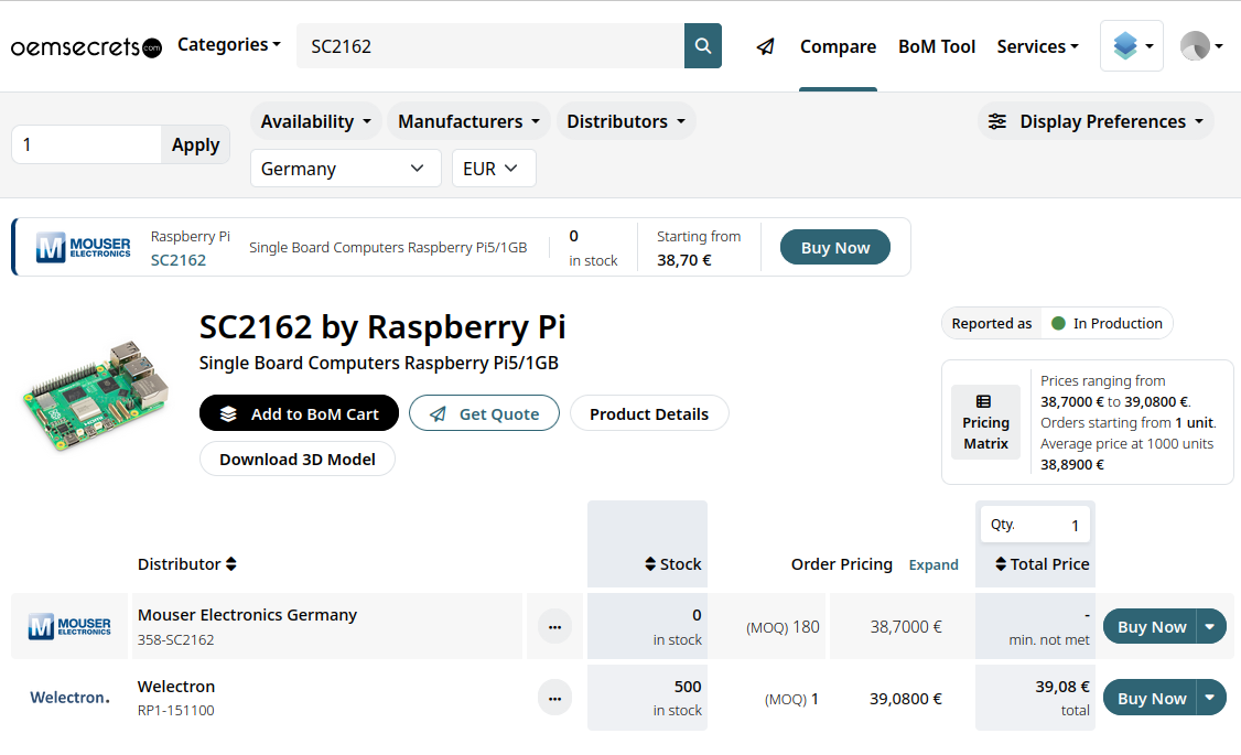 Eine OEMSecrets-Preisanalyse zeigt dann, dass die Raspberry Pi Trading ihre „eigenwillige“ Art der Auslieferung neuer Produkte beibehält. Zum Zeitpunkt der Abfassung dieser Newsmeldung gibt es - wie in den Abbildungen gezeigt - nur bei den Raspberry Pi-Spezialisten Stock; große Distributoren sind derzeit noch nicht lieferfähig.