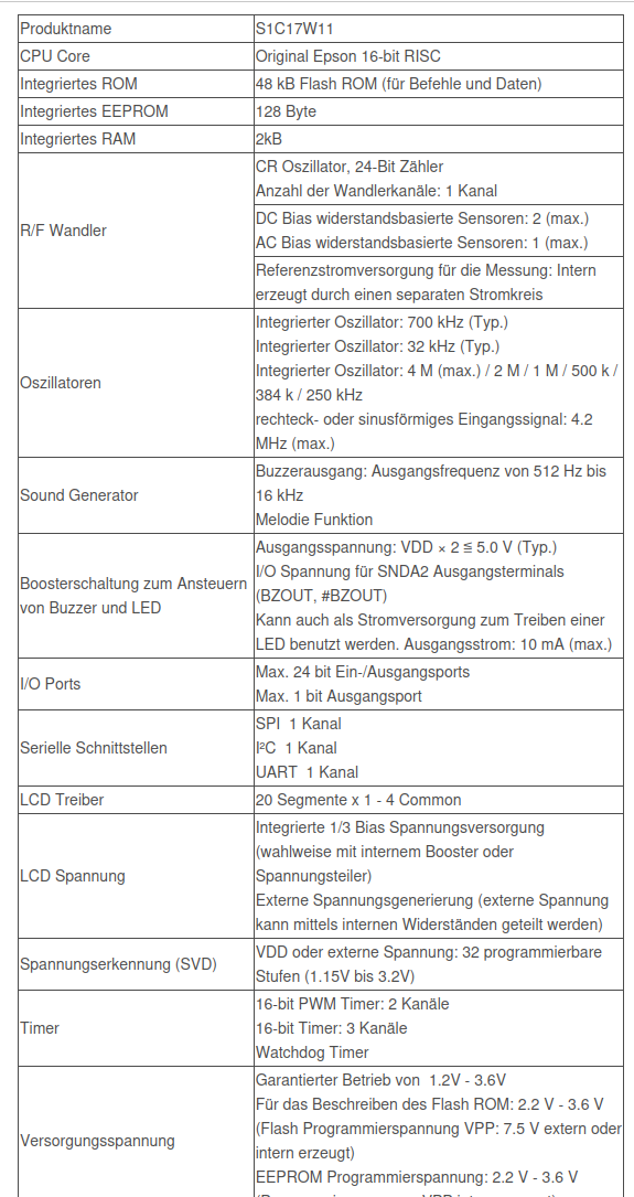 Epson S1C17W11 -sehr stromsparender 16bit-Microcontroller für Widerstandmessungsaufgaben