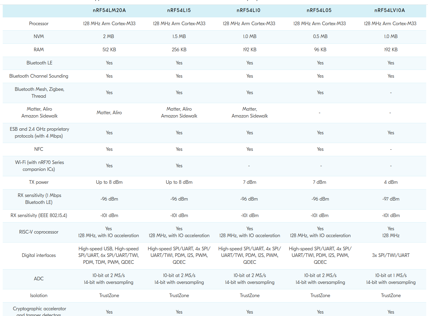 Sonst ist der nRF54LV10A im allgemeinen ein „gewöhnlicher“ nRF54. In der unter der URL https://www.nordicsemi.com/Products/nRF54LV10A bereitstehenden Produkt-Detailinformation findet sich dann die folgende Tabelle, die die Unterschiede aufzubrechen sucht.