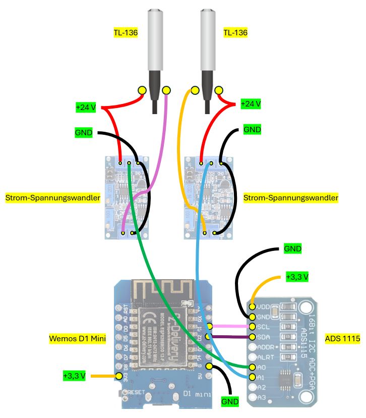 Ich habe einen TL-136 Drucksensor zur Füllstandsmessung einer Zisterne über ein Strom-Spannungswandler-Modul an einen ADS1115 AD-Wandler angeschlossen. Dieser liefert Daten an einen Wemos D1, das Ganze funktioniert wunderbar. Nachdem ich eine zweite Zisterne habe, überlege ich mir, ob ich die vorhandene Schaltung durch einen zweiten Sensor ergänze (siehe Skizze). Allerdings frage ich mich, ob sich die beiden Sensoren dann beeinflussen. Feedback welcome, bevor ich mir eine funktionierende Lösung zerschieße... Wenn das nicht möglich ist, baue ich eben die Schaltung noch mal parallel auf...
