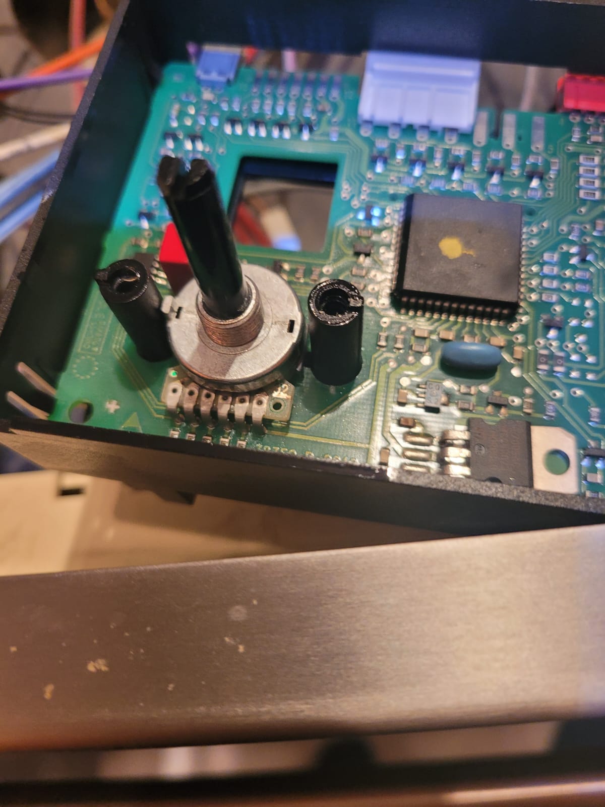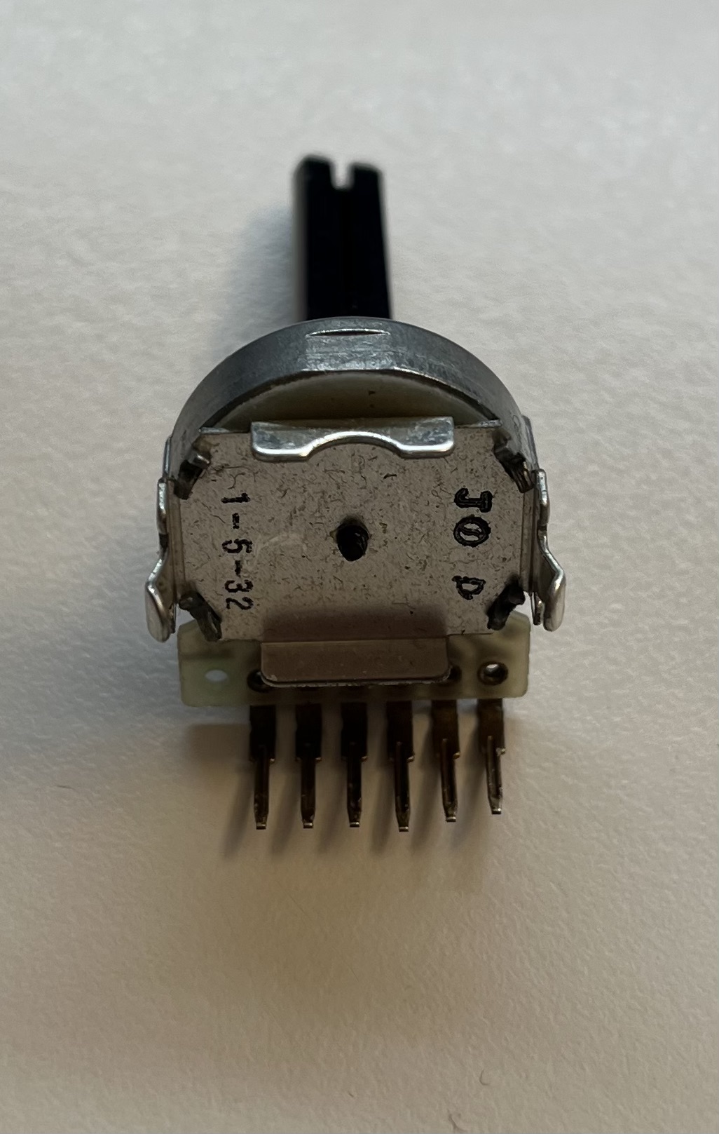 Hallo, ich suche diese Bauform von Drehencoder mit 6 Pins, endlos drehbar und Befestigt mit zwei zusätlichen lötlaschen rechts und links. Er spinnt auch nach gründlicher Reinigung, ich vermute die Hohlnieten die den übergang von den Beinchen auf die Kontaktplatte herstellen haben nicht mehr richtig kontakt. Vielleicht erkennt jemand den Hersteller oder die Bezeichnung. Verbaut im Bosch HB25055 Steuermodul 00483099