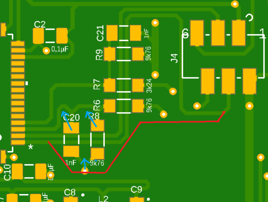 >Du musst die Leiterbahnen nicht immer gezwungenermaßen von hinten an die Lötpads heranführen jetzt bin ich verwirrt. Laut den Link von GHz N. sollen die Leiterbahnen in den Kerko zeigen und aus diesen heraus führen. "Kondensator nicht lose in den Strompfad einkoppeln" (linkes unteres Bild "Falsch" im Screenshot) https://www.lothar-miller.de/s9y/archives/12-Entkopplung.html Aber wenn das wie in deinem Bild auch geht, wäre es für mich leichter.