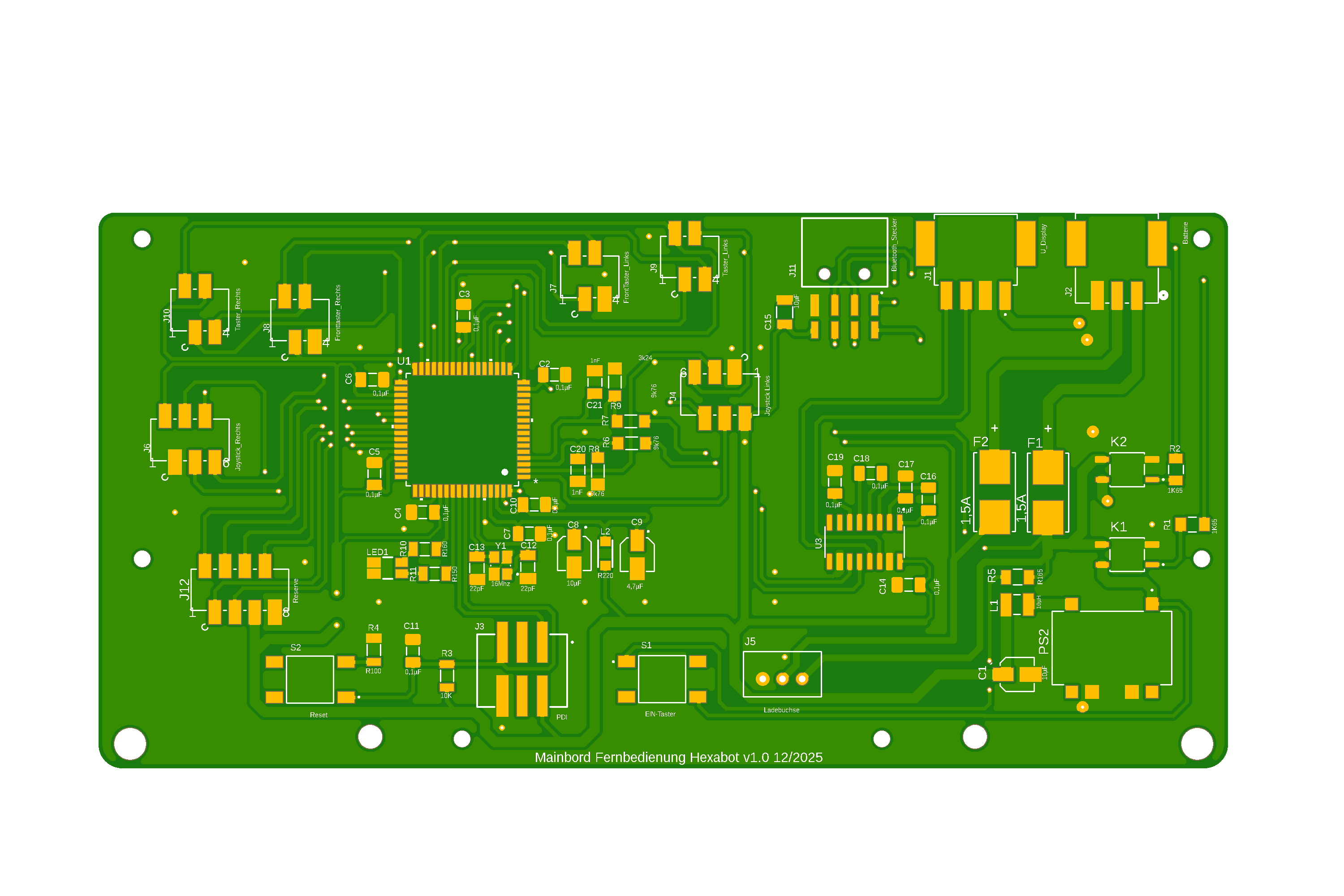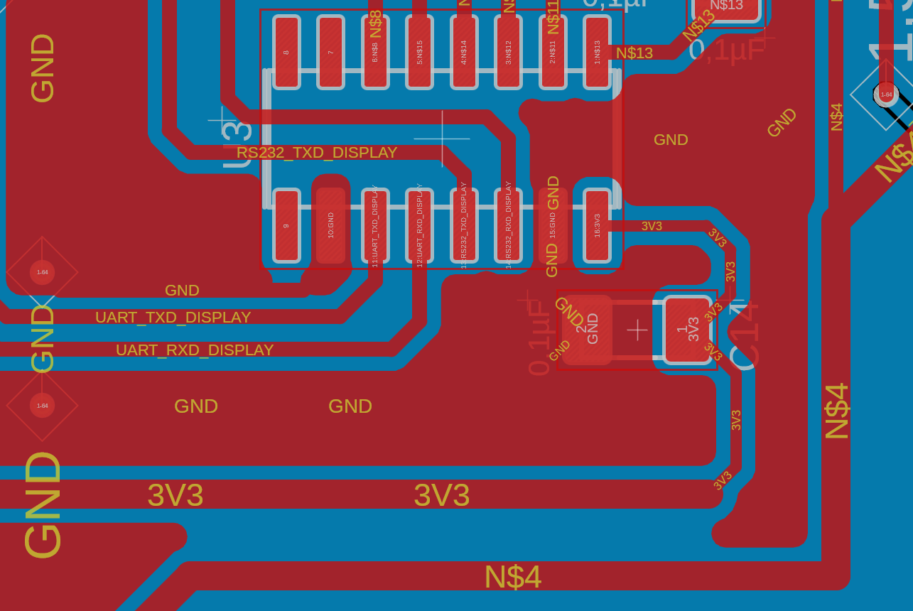 Hallo Thomas, ein Schaltbild wäre auch hilfreich, aber ich versuche es trotzdem auf die Schnelle vorm Frühstück. Sehr viele 90° Winkel, ich würde viele Leiterzüge auf 45° abschrägen und damit Abstrahlflächen minimieren - alles was (Digital) getaktet wird, sendet Störungen aus und die sollte man prinzipiell minimal halten. Und das errreicht man unter anderen durch kleine Schleifenflächen. Dann ganz wichtig: Masseflächen auf TOP und Bottom anlegen. Dient auch der Entstörung und sorgt auch für saubere Digitalpulse innerhalb der PCB. Zum Silksreen (Bestückungsdruck): Ich drehe die Schrift immer so, das alles aus einer Richtung lesbar ist. Und bei fast allen Steckern fehlt eine Bezeichung. J3 ist zu weit weg. Überhaupt nicht mit Beschriftung geizen, kostet ja nicht mehr, wenn man mehr rauf schreibt. Namen was das überhaupt für eine Platine ist, Spannungen, Schaltungsbereiche, Steckeraufgaben benennen, Herstellungsdatum. Alles was dir einfällt, was jemand der mal in fünf Jahren diese Platine defekt in die Hände bekommt, bei einer Reparatur helfen kann. Falls das KICAD ist, kannst Du mit gleichzeitigen Drücken von ALT+3 eine 3D Ansicht erzeugen (die auch mal hier reinstellen) Da sieht man immer erstaunlich viel selber, was man besser machen kann. Enger rücken oder weiter auseinanderrücken wegen Lötbarkeit. Nutze diese Möglichkeit. Und über was man überhaupt nachdenken könnte-allerdings weiß ich nicht, ob du die Tastaurplatine drunter hast und es nicht möglich ist- die Bauteile auch unten zu plazieren und damit wesentlich Fläche einzusparen.