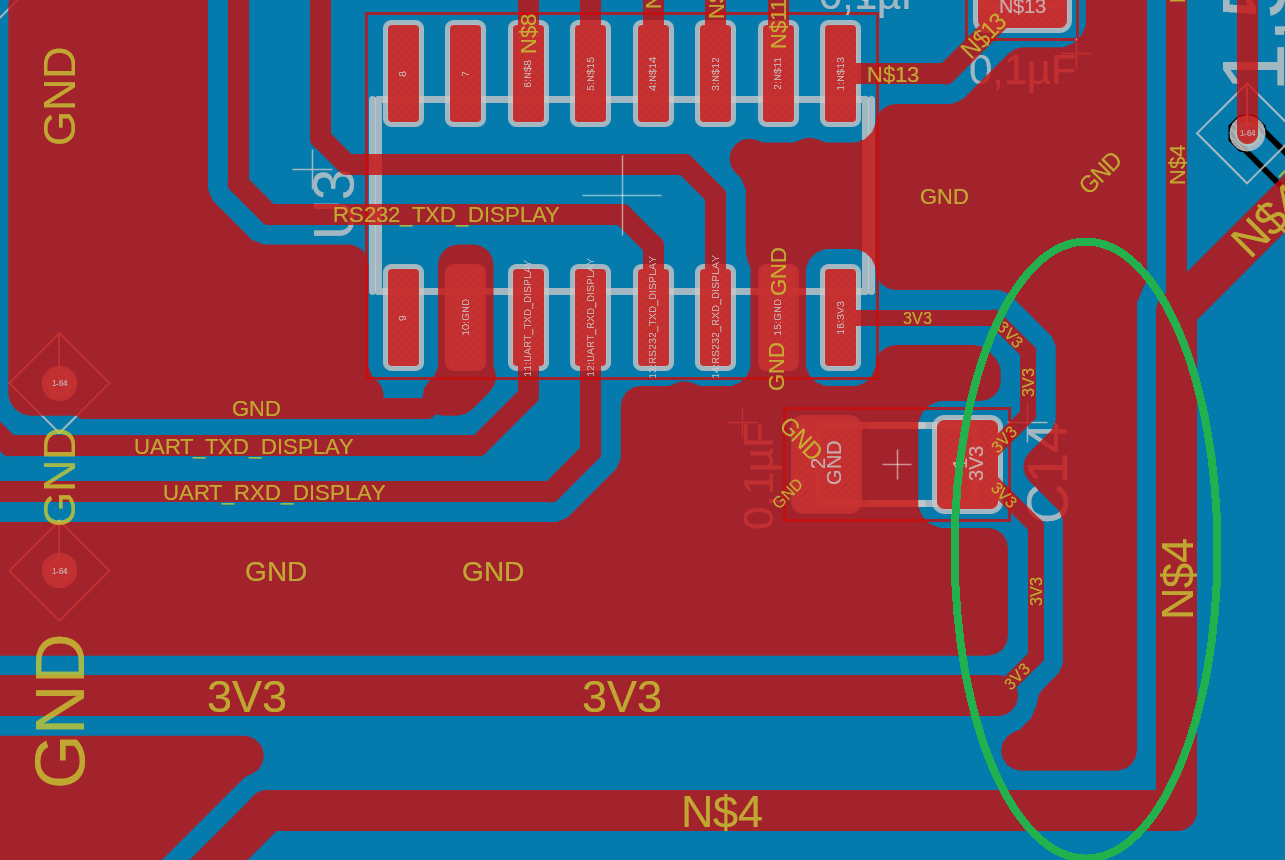 Thomas W. schrieb: > Wäre es denn sinnvoller auf die GND Flutung des TOP-Layer zu verzichten? Das aktuell lose Ende der "Antenne" müsste mit einem Via an Gnd angebunden werden. Oder du verhinderst, dass der Bereich geflutet wird, z.B. indem du das Signal N$4 so dicht an die 3V3-Leiterbahn heranschiebst, dass kein Platz mehr bleibt (kommt drauf an, ob N$4 von 3V3 geschirmt werden muss).