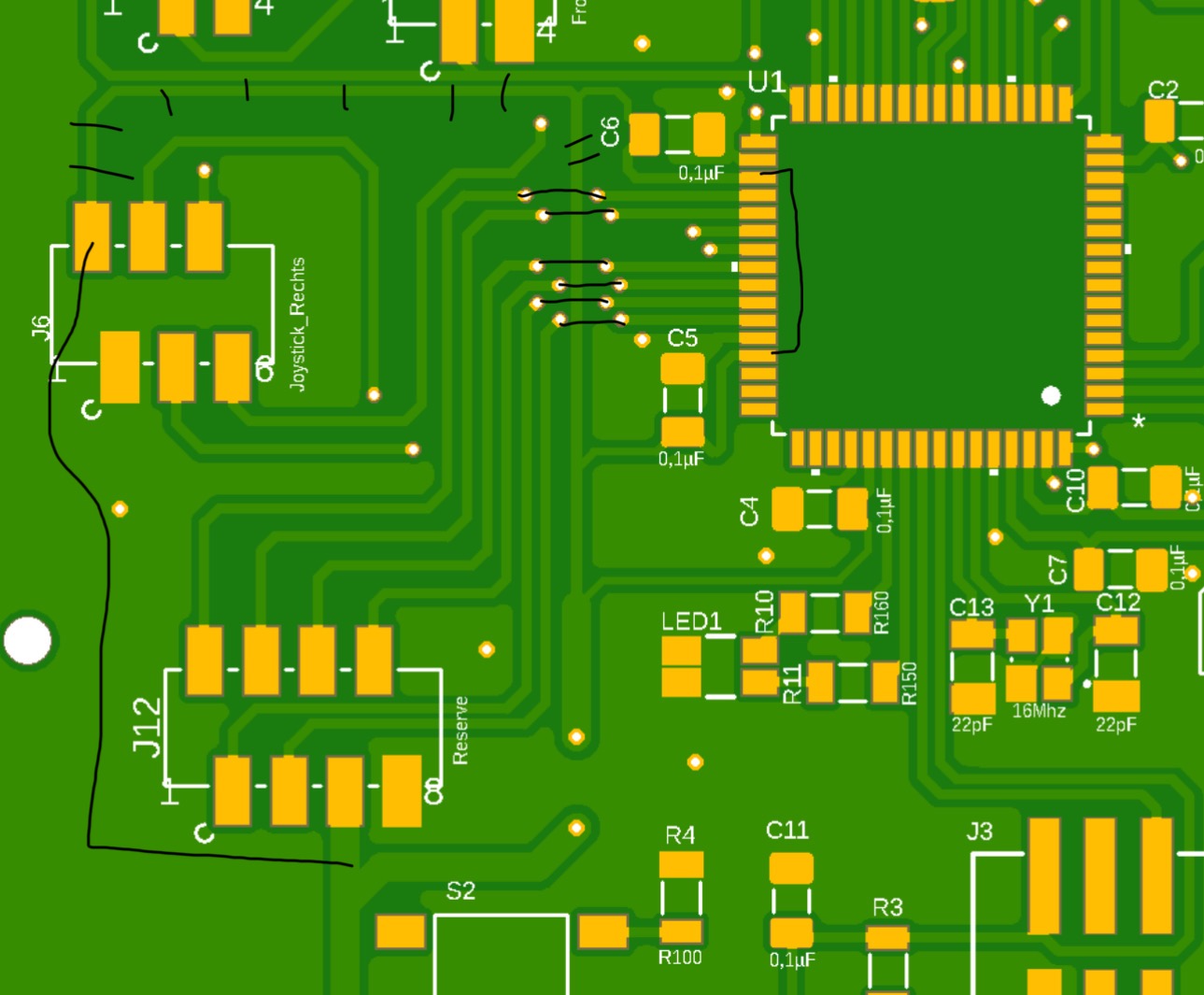 Um mit weniger Vias auszukommen habe ich alle GND vom µC unter diesem in