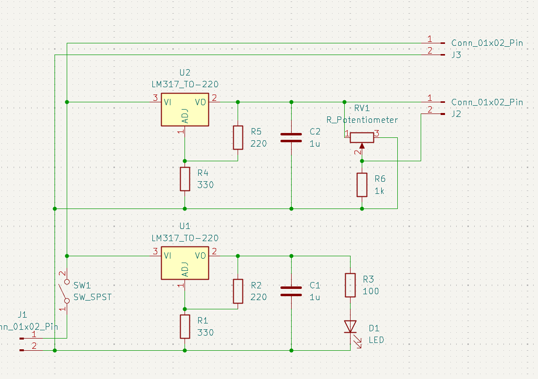 Hallo zusammen, ich habe aktuell ein Problem mit einer selbst entwickelten Platine und komme alleine nicht weiter. Vorweg: Ich bin absoluter Anfänger im Platinen- und Schaltungsdesign, also bitte ich um etwas Nachsicht. Anwendung: Ich möchte über die 12V-Steckdose im Auto eine 12V-Membranpumpe von KNF betreiben. Die Pumpe besitzt zusätzlich einen Steuereingang, der über eine Spannung von 0–3V geregelt wird: 0V: Pumpe aus, 3V: maximale Leistung Leider ist mir der genaue Pumpentyp unbekannt, und ich habe weder Datenblatt noch weitere technische Informationen. Ich betrachte die Pumpe daher als Blackbox. Schaltung / Konzept: Ich habe eine Platine entwickelt (Schaltplan füge ich im Beitrag an), die aus der 12V-Versorgung drei Pfade erzeugt: 1) 12V direkt zur Versorgung der Pumpe 2) 3V über LM317T zur Versorgung einer 3V-LED 3) 3V über zweiten LM317T, anschließend ein Potentiometer, um die Steuerspannung für die Pumpe zwischen ca. 0–3V einzustellen Die 12V für den Motor der Pumpe werden dabei nicht geregelt, sondern direkt durchgeschaltet. Problem: Nachdem ich die Pumpe angeschlossen und die Steuerspannung auf 3V eingestellt habe, läuft die Pumpe nur mit halber Leistung: gemessener Pumpenstrom: ca. 125 mA bei 12V, erwartet: ca. 250 mA bei 12V (maximale Leistung) Das Merkwürdige daran: Die gemessene Steuerspannung an den Pumpenkontakten beträgt stabil 3V, so wie vorgesehen. Wenn ich jedoch eine externe, separate 3V-Spannungsquelle für den Steuereingang verwende, läuft die Pumpe sofort korrekt mit voller Leistung (~250 mA). Was ich bereits geprüft habe: Stromaufnahme am Steuereingang der Pumpe: < 1 mA Ich halte es daher für unwahrscheinlich, dass der LM317 strommäßig überlastet ist. Vermutung: Ich vermute aktuell, dass das Problem damit zusammenhängt, dass Versorgung (12V) und Steuerspannung (3V) aus derselben Quelle stammen und Masse gemeinsam genutzt wird. Allerdings kann ich mir nicht schlüssig erklären, warum das in dieser Konstellation zu dem beschriebenen Verhalten führt. Frage: Hat jemand eine Idee, woran das liegen könnte oder schon einmal ein ähnliches Verhalten beobachtet? Gibt es bei solchen Pumpen oder bei der Erzeugung der Steuerspannung mit LM317 typische Stolperfallen, die ich übersehe? Vielen Dank im Voraus für jede Erklärung oder jeden Denkanstoß. Viele Grüße, Sebastian