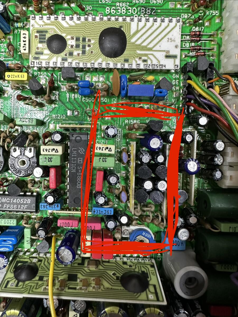 Ich habe da jetzt einiges ausgelötet und geprüft. Bisher noch nichts gefunden. Aber es gibt neue Erkenntnisse. Ich habe den rot umrandeten Bereich als Verursacher eingegrenzt. Wenn ich diesen Bereich mit Weicon Kältespray besprühe und ca. 5 Sekunden warte wird der Ton hörbar besser und das sporadische knacken verschwindet bis der Ton ganz sauber ist. Erwärme ich diesen Bereich mit dem Heißluftfön vorsichtig kommen die Störgräusche wieder. Das knacken ist übrigens immer gleich laut. Egal wie ich die Lautstärke einstelle. Jetzt hol ich mal nach und nach die Bauelemente in diesem Bereich raus und messe sie mal durch. Also primär die Kondensatoren.