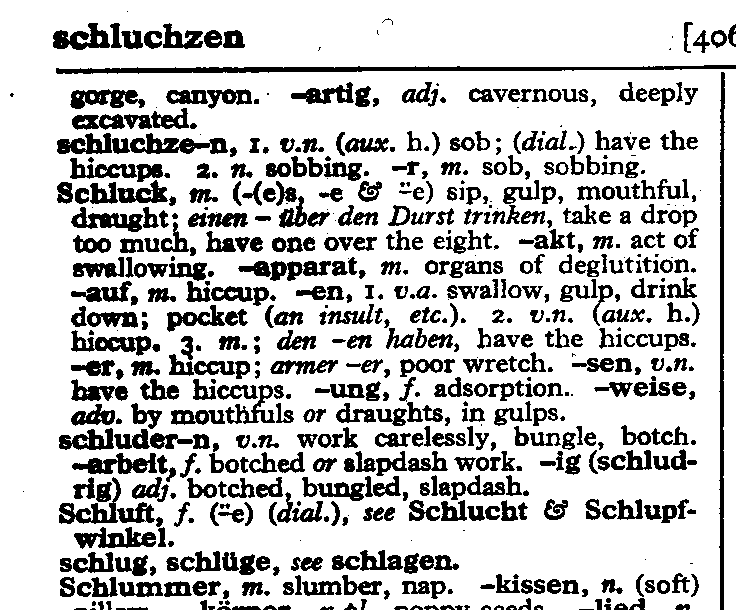 H. H. schrieb: > Schau mal in ein engliches Wörterbuch Bittesehr, Cassel's German & English Dictionary (1963) "sip" würde ich eher als Schlückchen verstehen. Und "gulp" wäre auch richtig gewesen.