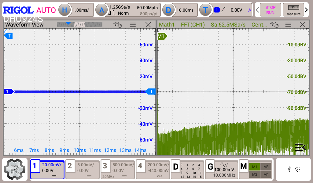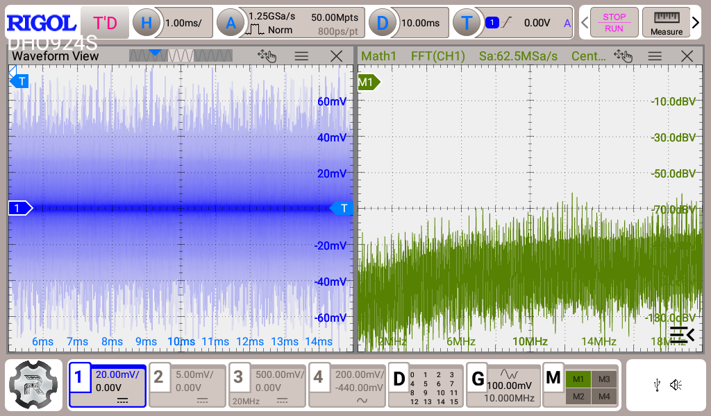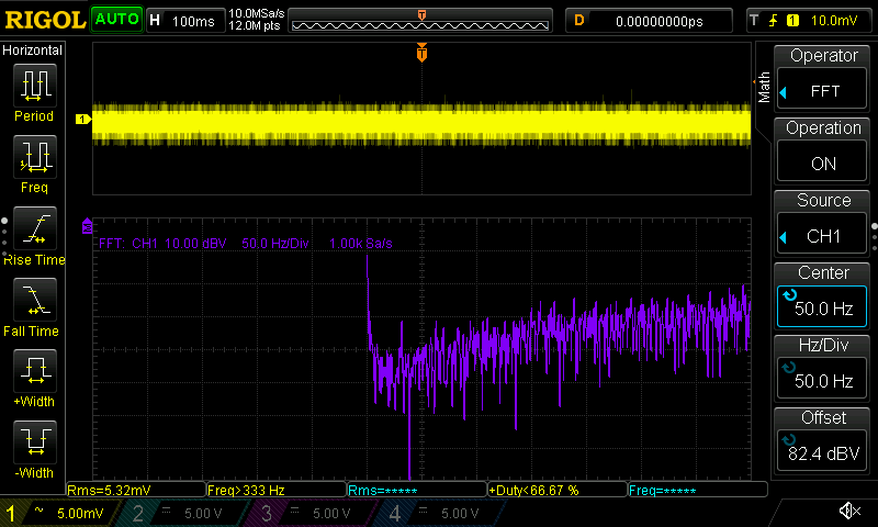 Hallo, ich hoffe die Messung ist so i.O. Habe immer darauf geachtet das die Massefeder Kontakt hat. Was man nicht sieht ist, dass Scale auf 20dBV eingestellt. Mit "alles aus" meine ich es liegt keine Spannung an. Grundrauschen im Raum? Eingestellte PWM war 50% Duty. Dabei fließen ca. 90mA durch die Leds. Mit "Led" ist am + der Led-Leitung am Stecker gemeint, die am Kabel hängen. "C5" ist am µC.