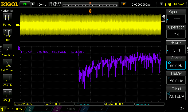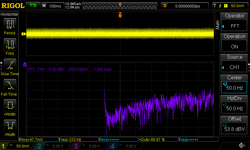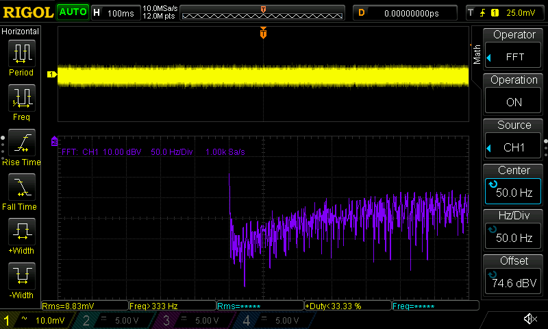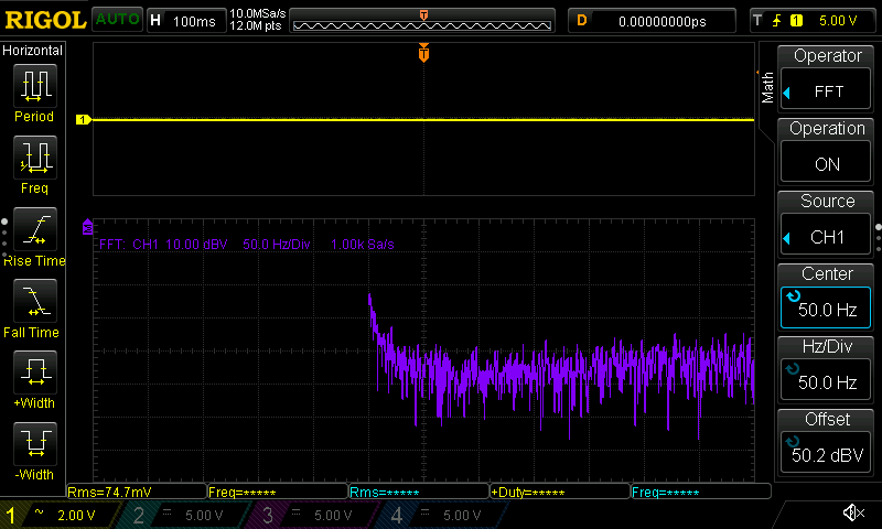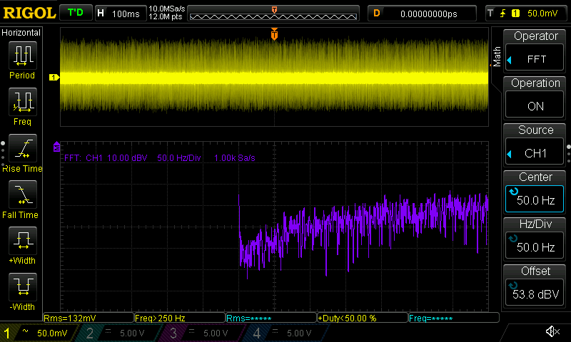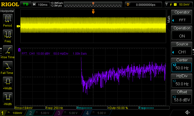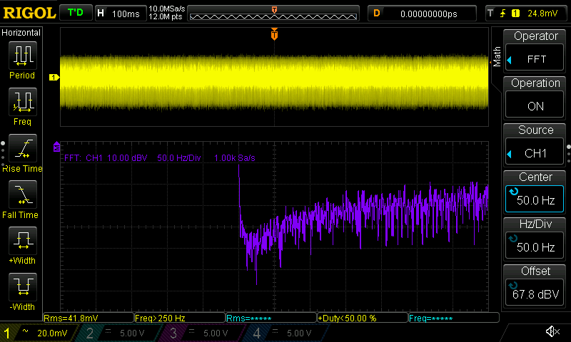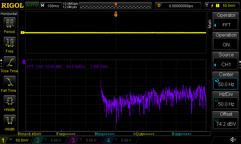 Hallo Rick, meintest du mit "Y-Verstärkung: so hoch wie möglich" mehr Volt pro Div oder feiner? Mehr wie 10V/Div kann ich nicht einstellen außer ich schalte den Tastkopf auf 10:1 um. Wirkt sich auch nur auf die gelbe Linie aus, was Standardmessung ist, also kein FFT. Das kann man hier sicherlich gut sehen. Beitrag "Re: VIN am Konstantstromtreiber?" Die violette FFT Linie kann ich nur mittels dBV Scale einstellen, womit nur bis runter auf 10dBV Sinn macht ohne aus dem Bildschirm rauszufliegen. Die 100ms habe dummerweise überlesen. Ich werde die Messung die Tage wiederholen. Ist deine gezeigte Messung gut oder schlecht? Bei dir blau ist der AC Ripple?