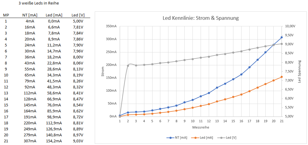 Hallo, dann hatte ich noch eine Messreihe mit den hinterlegten Helligkeitsstufen gemacht. Ich hatte vor allen Messungen noch von 2 auf 3 weiße Leds gewechselt, weil mit nur 2 Leds diese bei "aus" geglimmt haben mit 70µA Led Strom. Vout war zu nah am "aus" mit 5V Ausgangsspannung. Im Diagramm sieht man den Eingangsstrom mit 5V zum Led Strom und wie Vout langsam mit ansteigt.