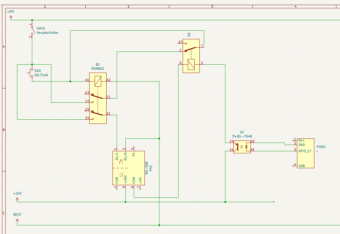 Hallo Zusammen, Mein Raspberry sitzt in einem Schaltschrank verbaut für Sensorik mit RS-485. Hatte bereits zu dem RS-485-Thema einen Beitrag: Beitrag "RS485 Terminierung und Verdrahtung 3 Geräte" Raspberry und Sensoren werden durch ein Mean Well RD35B Schaltnetzteil mit 24V und 5V Ausgang versorgt. Hier gehts es mir jetzt um das Zuschalten und trennen des Netzstroms. Der geplante Aufbau ist wie folgt: 1. Hauptschalter: Trennt den Schaltschrank vollständig vom Netz. 2. Einschalt-Taster: Kurzer Druck bringt das Schütz Q1 in Selbsthaltung per NO-Hilfskontakt und versorgt das Netzteil mit Strom. 3. Abschaltung: Soll per Shutdown-hook des Raspberry ausgelöst werden. Dabei soll ein GPIO ein Koppel-Relais (NC, 24V-> 220V) öffnen dass die Selbsthaltung des Schütz Q1 unterbricht und damit das Netzteil von der Netzspannung trennt. Nun zu meiner Frage: Das ganze soll im Schaltschrank mit möglichst DIN-Schienen-Komponenten passieren. Ich würde gerne auf die üblichen Relaisboards die es für Raspberry gibt verzichten, einfach weil ich sauber auf DIN-Schiene montieren und verdrahten möchte. 220V Schütz und 24V-Relais sind da natürlich kein Problem passende zu finden. Einzig beim dem Optokoppler-Relais das mit 3.3V als Eingang vom Raspberry arbeiten kann finde ich so gut wie nichts im Netz von den üblichen verdächtigen (Phoenix, Eaton, Schneider, etc.) Hier werde ich lediglich bei Amazon fündig und das scheint zu bieten was ich benötige. https://shorturl.at/NBewd Hat jemand Erfahrung damit, oder eine Alternative? Von den elektrischen Daten scheint es zu passen. 100mA max. sollten auch für zum beispiel dieses Relais von Finder ausreichend sein: https://www.reichelt.de/de/de/shop/produkt/installationsrelais_1x_nc_1x_no_250v_25a_24_v_ac_dc-391066?PROVID=2788&gad_source=1&gad_campaignid=1622074784&gclid=CjwKCAiA9aPKBhBhEiwAyz82Jyjcmk2uM848uCzOFCaf92NoL0JDSJw2sEcagnTDkHjiPkE7fycajBoCJvQQAvD_BwE