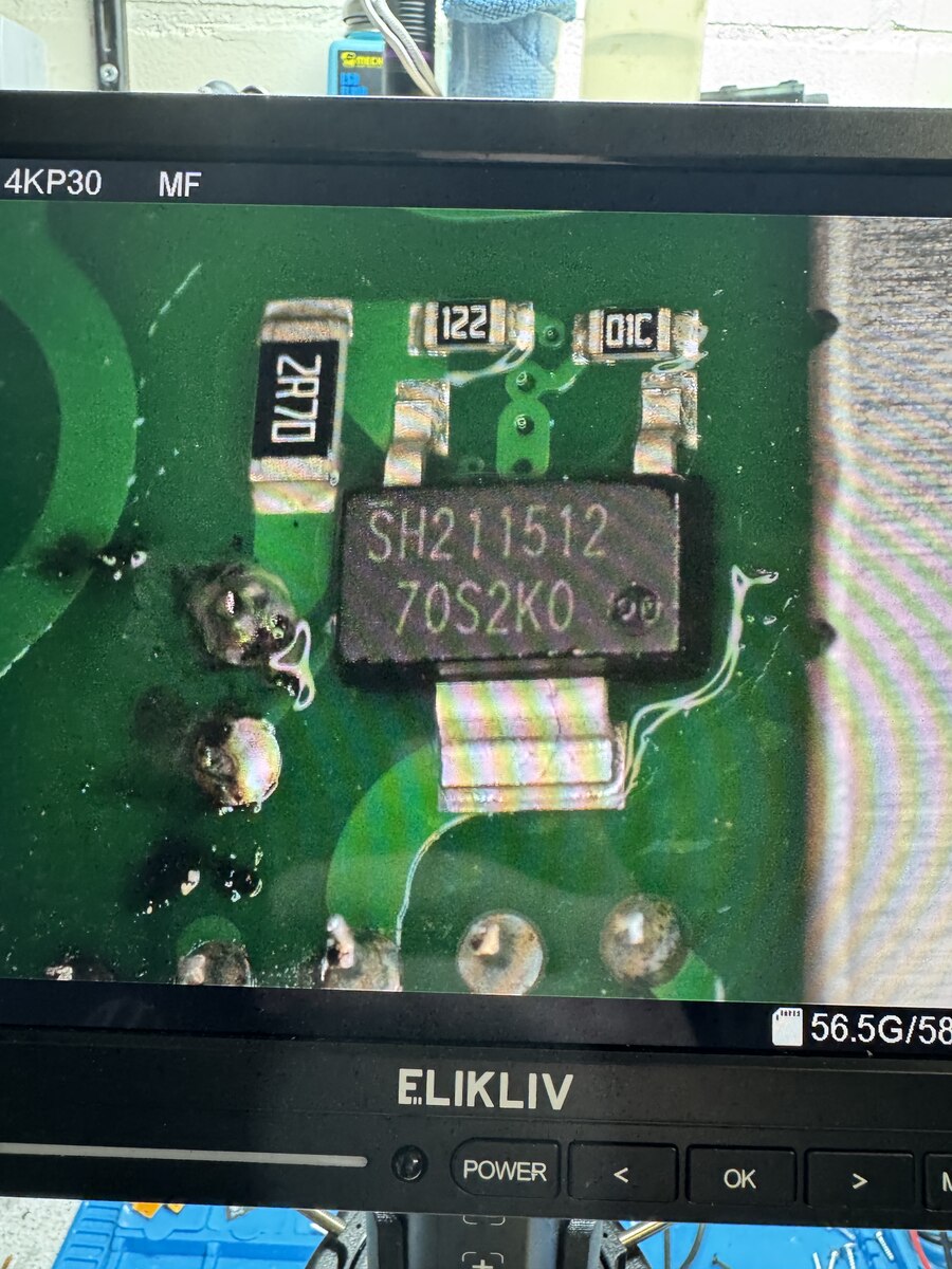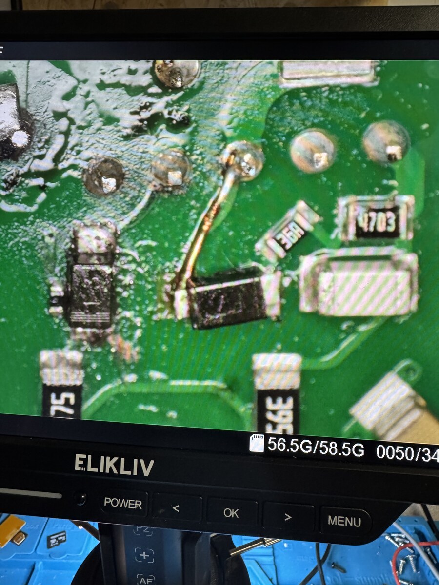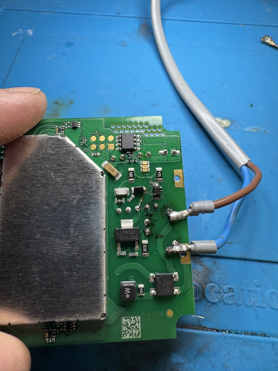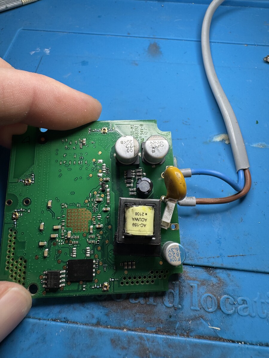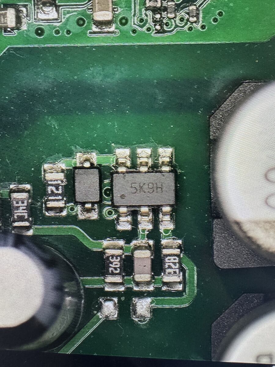Hallo, ich habe hier vor mir einen Fritz!Repeater 600 der keine Versorgungsspannung für den Digitalteil liefert. Die Eingangsspannung ist bis nach dem Brückengleichrichter vorhanden. Wie auf dem einen Bild zu sehen, musste ich eine provisorische Kuperdrahtbrücke ziehen da es ein Pad einer Diode komplett weggerissen hat. Diese Diode habe ich erstmal gegen eine identische getauscht, leider ohne Erfolg. Die beiden Chips (vermutlich ein Transistor und ein Schaltregler) kann ich leider nicht identifizieren bzw. ein Datenblatt zu finden. Jemand eine Idee was es evtl. sein könnte bzw. was ich noch überprüfen könnte?