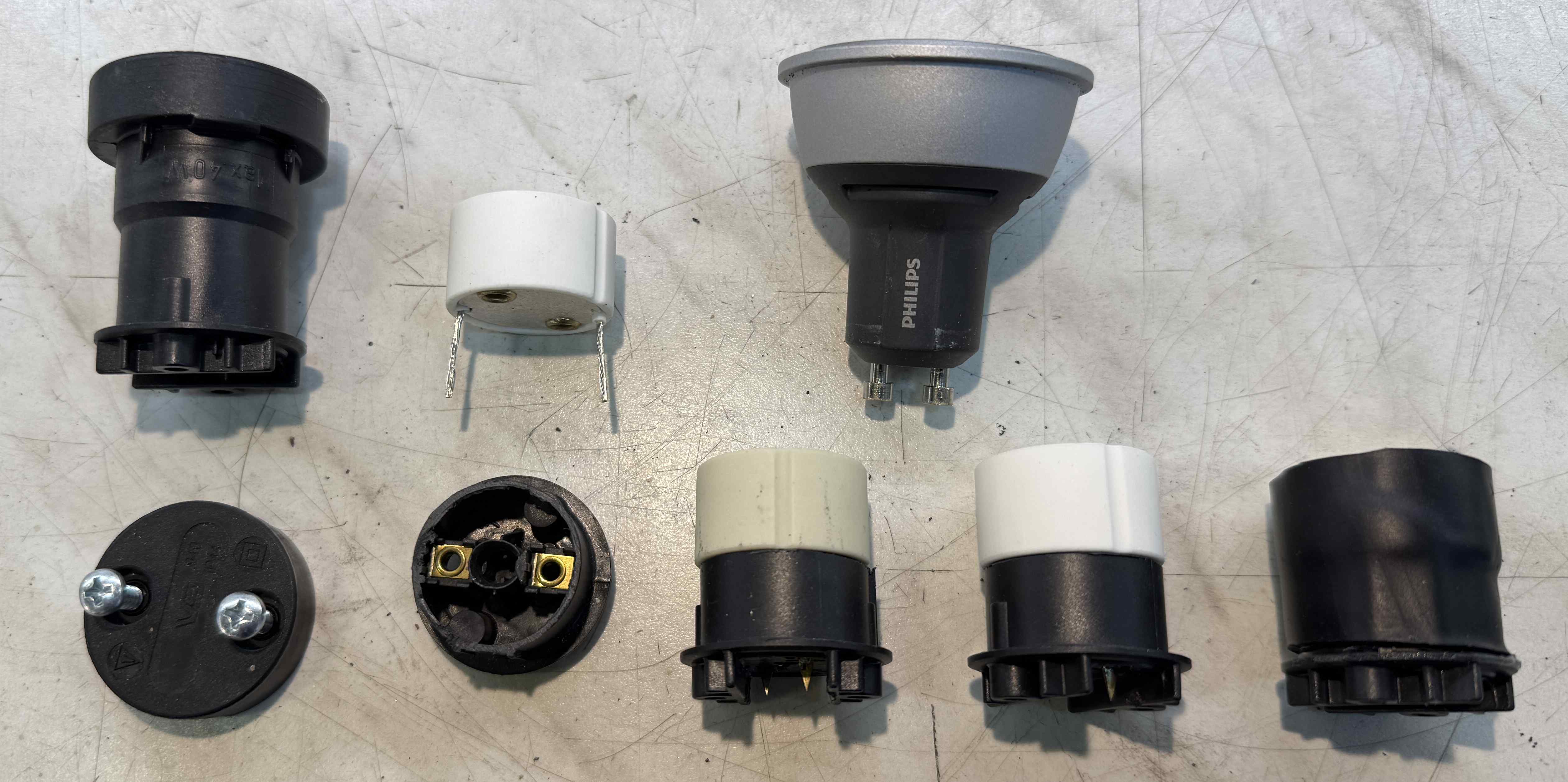 Während der ruhigen Tage habe ich mich mal mit dem grundsätzlichen Design solcher Illuminationsfassungen beschäftigt (diese sind von Vossloh) und einen Weg gefunden ohne allzuviel Aufwand aus einer gewöhnlichen E27 Illufassung eine GU10 zu machen, siehe Bild. Den ganzen Gewindeteil gerade absägen (vorher die beiden Messingkontaktzungen innen abbrechen) die Anschlußleitungen der GU10 (ohne jede Aderisolierung) durch die verbliebenen Nietlöcher stecken und hinten mit den "Nägeln" verlöten. Das Ganze dann mit einem Stück Schrumpfschlauch zusammenkleben. Hält bombenfest und ist 100% isoliert. Dauert bei Serienfertigung keine 3 Minuten pro Stück. Das ist immer noch weniger Zeit als das umständliche Gefrickel bei jedem einzelnen GU10 Strahler eine wie auch immer geartete Klemmdose zu setzen. Der eigentliche Anschluß an die Illuleitung dauert dann 30 Sekunden.