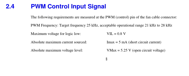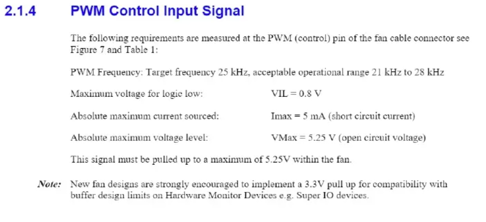 Ah...das gibt ja wieder ein Diskussion. Ich hatte selbstverstaendlich die Doku gelesen. Ich verstehe gar nicht wie man anders denken kann. :-D Allerdings hab ich hier nur die aeltere Version. Ich teile eigentlich die Einstellung von Noctua das Open-Kollektor eher Kacke ist wegen der Flankensteilheit. Vor allem dann wenn nicht die Frequenz direkt gemessen wird sondern erst mal die Spannung daraus hergeleitet wird. > An einem Push-Pull-Ausgang ist die Drehzahl dann falsch, und (bei 3.3V > Push-Pull) nicht der ganze Drehzahl-Bereich erreichbar. Genau das waren naemlich meine Befuerchtungen. Dann bin ich mit 3.3V bei 100%ED bei 66% von 5V. Aber die Intel V1.3 die man hier angefuehrt hat spricht ja ausdruecklich von 3.3V pull up. Was natuerlich bedeutet das es auch Luefter gibt die es anders gemacht haben. New fan designs are strongly encouraged to implement a 3.3V pull up for compatibility with buffer design limits on Hardware Devices e.g Super IO Devices. Ich versteht das so das der 3.3V Pullup im Fan sein soll. Ihr auch? Und natuerlich koennte man dann auch direkt 3V3 PushPull machen, was ich gerade mache. Bringt mich zu der Frage, was macht eigentlich mein Luefter? :-) Es ist im uebrigen ein Original AMD-Luefter den AMD mal bei meiner Boxed-CPU mitgeliefert hat. Ziehe ich da das Kabel ab so geht der Luefter auf eine mittlere Drehzahl, merkt also das er keine PWM mehr bekommt. Messe ich da mit dem Multimeter am Eingang so sehe ich 0.5V. :-o Also vermutlich macht jeder Luefterhersteller das so wie er Bock hat. Und das vermutlich deshalb weil die Spezifikation von Intel irgendwie fuern Arsch ist. Wer weiss wie da noch V1.0 oder V1.1 aussah. Und das entspricht auch den allgemeinen Erfahrungen von Leuten die selber Rechner zusammenbauen. Nicht jeder Luefter arbeitet mit jedem Board gleich gut zusammen und nicht ohne Grund muss man im Bios noch Kennlinien der Luefter hinterlegen wenn man es gut machen will. Bei AMD ist aber mit sicherheit eine MCU im Luefter. Mit 15% laeuft der Luefter mit Minimaldrehzahl, darunter steht er dauerhaft fest. Laeuft er mit 15% und ich halte ihn von Hand fest steht er und ich kann nicht nicht wieder von Hand anwerfen. Allerdings nach 10s wird er von seiner Regelung neu gestartet und geht dann wieder auf 15%. Da findet also etwas nichtlineare Regelung im Luefter statt. Vanye