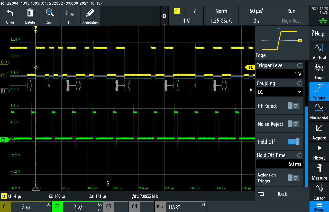 Hallo, Mein Oszi hat Funktionen der HF-Unterdückung und der limitierter Bandbreite, die reichen aber nicht so weit 'runter. In de Tat, Brückenschaltung. Differentiell kann ich direkt nicht messen, gemäß eines alten Beitrages im Forum hab ich 2-Kanalig gegen Masse gemessen, die Kanäle gegeneinander verrechnet, Bild entsteht. Ein Bild wie bei Rainer hätte ich gern gesehen, es sollte aber nicht sein. Die Ursache liegt wohl darin, wie Mark schrieb, das es ein "filterless Class-D-Amp ohne Ausgangsfilter" ist. Da hat man nur mehr oder weniger "dichte" Spikes vom Ein/Aus-Schalten. Der akustische Rekonstruktions-Filter ist (wohl) der Lautsprecher. Den elektronischen hat sich der Designer das gespart. Triggern mit dem Verstärker-Eingangssignal werd' ich gleich mal probieren. Danke! Ibram