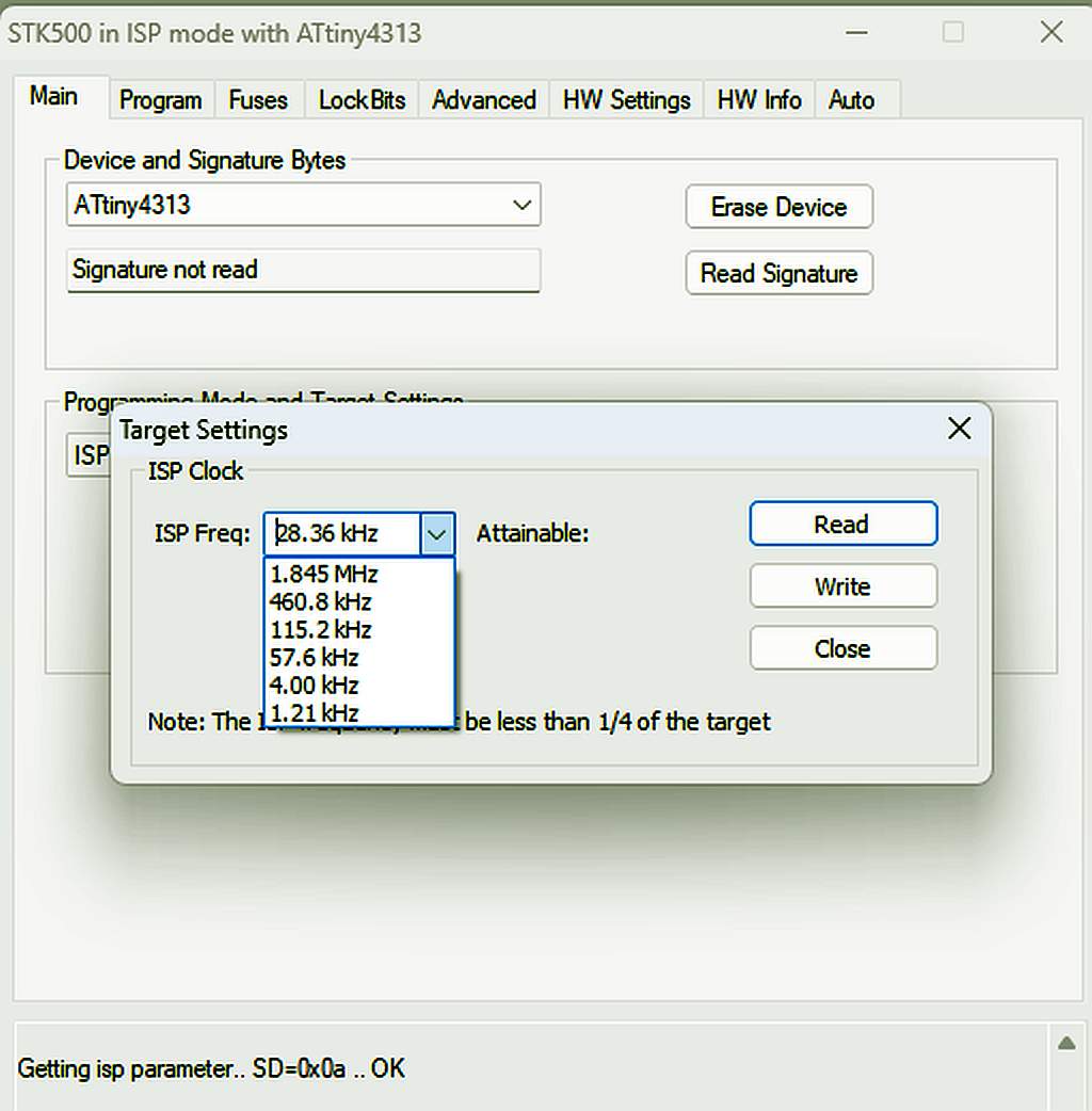 Rene Z. schrieb: > Ich habe die Einstellungen bei der Arduino-IDE geklaut. Da stand 19200. > Hatte es auch mit 9600 ohne Erfolg probiert. Falscher Parameter. Wie gesagt hast du damit die Baudrate des COM Ports geändert, nicht die Bitrate der ISP Schnittstelle.