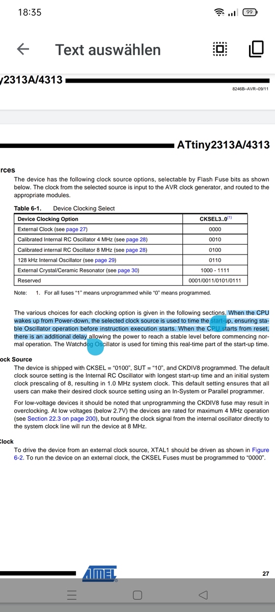 H. H. schrieb: > Aha, also schlampige Dokumentation von Atmel. Es ist dokumentiert. Wobei ich das auch erst verzögert begriffen habe, als ich die Fuses auf duesen Extremfall einstellte und mein Programmieradapter nicht so langsam takten konnte (ist lang her und wurde vom Hersteller des Programmieradapters behoben, nachdem ich ihm davon berichtete).