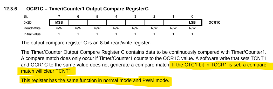 Das ist falsch. Wenn du über OCR1C die PWM-Frequenz bestimmen willst, muß in GTCCR sowohl das CTC1- als auch das PWM1A-Bit gesetzt sein. Erstaunliche Leseschwäche, das richtige Kapitel hast du ja selbst angegeben und so furchtbar viel Text ist da nicht zu lesen...