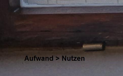 H. H. schrieb: > Und es wird einen Grund für das Fehlen der > zweiten Hälfte der Führung geben, das hatte wohl beim Öffnen an der > Fensterbank gestreift. Mir scheint die Führung am Flügel ist zu sehen, die starre Aufnahme am Rahmen aber entfernt. Grund dürfte ggf. einfach morsches Holz in diesem Bereich von Flügel und Rahmen sein.