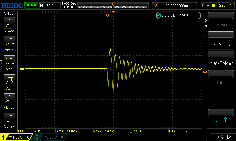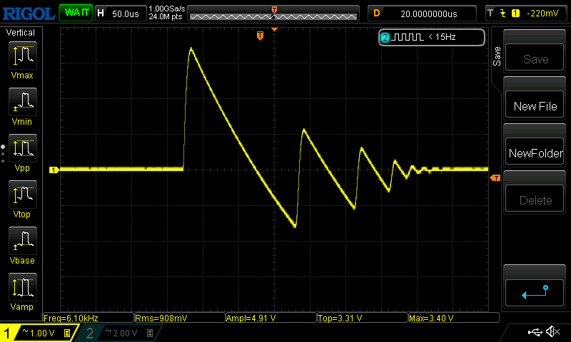 Hallo, es geht um die Netzteilschaltung aus diesem Beitrag: Beitrag "Re: Labornetzgerät - Fragen zum Schaltplan". Ich habe sie auf einem Breadboard aufgebaut, die Ausgangsspannung lässt sich von 0–25 V einstellen und funktioniert grundsätzlich. Beim Ein- und Ausschalten der Last treten jedoch deutliche Überschwingungen auf, während die Simulation nahezu ideal ist. Zwei Oszilloskopbilder (Ein/Aus) habe ich angehängt. Ausgangsspannung war 10V. Woran liegt das? Ist das ein Effekt des Breadboard-Aufbaus? Würde eine sauber geroutete Platine das verbessern? Und was müsste man in der Simulation ergänzen, um dieses Verhalten nachzubilden? Danke!