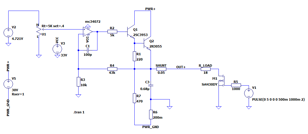 Michael B. schrieb: > Fraglich sind die 50mOhm hinter dem Spannungsteilerabgriff. Da messe ich mit INA226 Strom Michael B. schrieb: > Stützkondensator sehe > ich nicht. Ist natürlich auf dem Breadboard vorhanden Michael B. schrieb: > Die 100pF musst du anpassen Die macht den opamp doch langsamer? Der schafft ja im Moment die steigende Spannung nicht schnell genug runterregeln. Michael B. schrieb: > Die 5k wurde ich kleiner machen, so 100 Ohm Meinst du R2? Dort soll nachher die Diode für Stromregelung hin. Mit kleineren Widerständen hatte ich Probleme mit Kurzschluss am Ausgang. Ich habe testweise parallel zu R2 330pF Kondensator angeschlossen, ist besser geworden aber mit der Simulation kein Vergleich. Morgen mache ich weitere Messungen und gucke mir Masseverbindungen an.