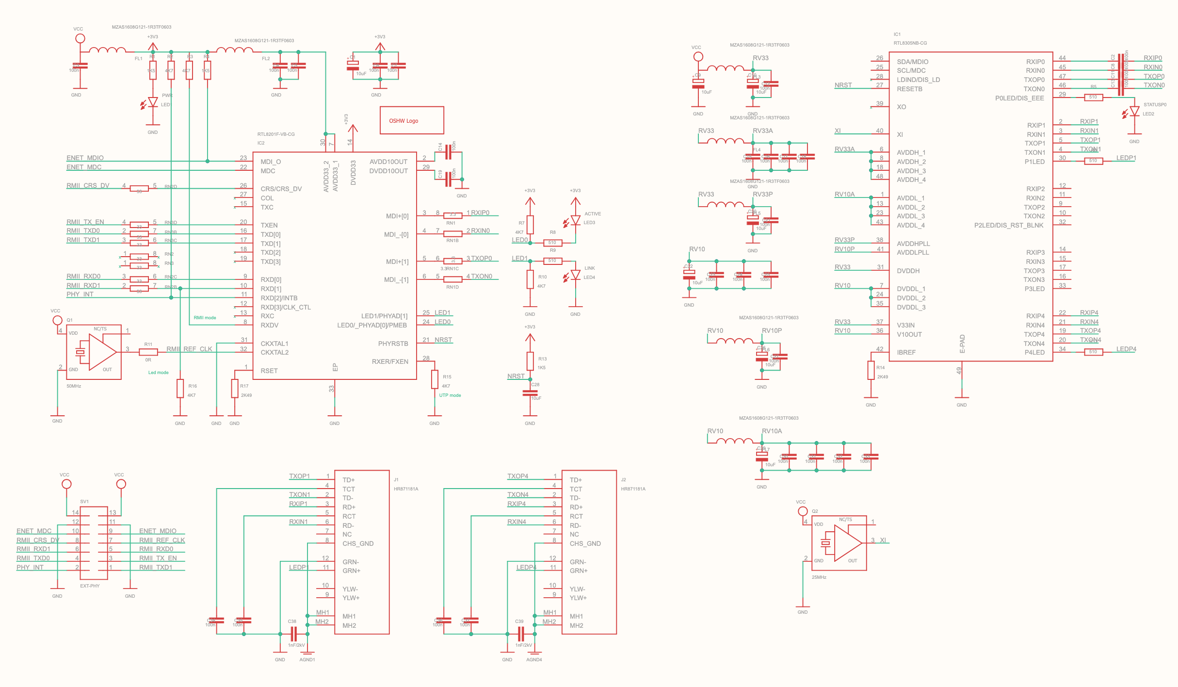 Hallo zusammen, angehängte Schaltung eines RTL8305 Netzwerk Switches funktioniert nicht. Ist da grundlegend etwas falsch? PCB hat Impedanz- und Längenmatch. Inwieweit können C1 bis C4 dafür verantwortlich sein? Das Signal kommt aus einem PHY. Danke!