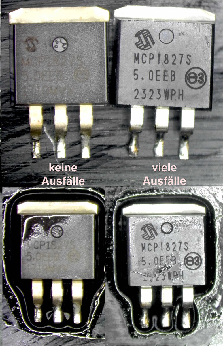 Hallo und ein erfolgreiches neues Jahr allerseits. Wir verwenden seit gut drei Jahren den MCP1827S (im DDPAK Gehäuse) um von einer Eingangsspannung von nominell 5.7V auf 5V herunterzuregeln. Es handelt sich insgesamt um etwa 300 Platinen und seit wenigen Monaten gibt es bei neuen PCBs vermehrt Ausfälle dieses LDOs. Folgend ein paar Hintergrund-Informationen: Die Platine sitzt in einer elektro-magnetisch fordernden Umgebung (Frequenz Umrichter). Die 5V werden zur Versorgung einiger Gatter und Transceiver (RS485, LVDS, ...) benötigt. Das 5.7V Rail versorgt ein FPGA (natürlich noch über einen folgenden Step Down Converter). Beide Spannungsrails wurden mit optisch isolierten Probes vermessen und sehen recht gut aus. Der MCP1827S sollte laut DB nur bis 6V verwendet werden (Abs. Max. ist 6.5V); laut den Messungen (mit >100MHz Bandbreite) bleibt die Spannung stets unter 6V. -- Er sollte also nicht wegen Überspannung sterben. Am Ein- sowie am Ausgangsspin des LDO sitzt direkt jeweils ein 10uF 0805 MLCCs; --> Stabilitätsprobleme sollten somit eher nicht auftreten (auch in den Messungen war kein Schwingen o.ä. zu sehen). Der benötigte Strom ist eher gering (<250mA) und der LDO ist gut an eine große Massefläche angebunden, d.h. er wird im Betrieb nur wenige Grad wärmer als die Umgebung (ca. 40°C Umgebung). --> Auch die Temperatur darf kein Problem darstellen. Die PCBs werden bei einem großen Fertiger gelötet, ich kann mir nicht vorstellen, dass nur der LDO dort plötzlich wegen zB ESD vorgeschädigt wird. Das Bauteil sollte sogar kurzschlussfest sein (wir haben aber auf keiner Platine einen Kurzschluss gefunden) - mir fällt kein plausibler Zerstörungsmechanismus mehr ein. Beim Vergleich von schon lange funktionierenden Exemplaren mit frisch verstorbenen, ist aufgefallen, dass die anders aussehen - siehe Foto. Deswegen die Kernfrage: Sieht das recht Bauteil nach einer Fälschung aus? Link zum Datenblatt: https://ww1.microchip.com/downloads/aemDocuments/documents/APID/ProductDocuments/DataSheets/MCP1827-Data-Sheet-DS20002001.pdf Danke vorab und viele Grüße, Thomas