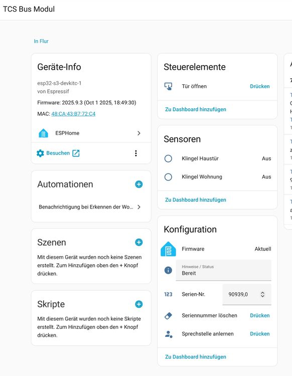 Dies ist keine Frage sondern nur eine Information für alle, die ein SmartHome über HomeAssitant betreiben und Teilnehmer an einer Klingelanlage mit TCS-Bus sind. Also, falls jemand Interesse hat: Ich habe noch HomeAssistant-fähige TCS-Bus-Bausteine übrig, die direkt in der Unterputzdose der Türsprechstelle eingebaut werden können und sich per WLAN mit dem HomeAssitant verbinden. Es werden beide Klingelbetätigungen (Haustür und Wohnungstür) unabhängig gemeldet und es ist möglich den Haustüröffner zu betätigen. Die würde ich zum Selbstkostenpreis abgeben (Grösse: 40mm x 40mm x 20mm, Anschluss 3pol. A, B, P) siehe Bilder. Und falls zusätzliche Ideen zur Verwendung des TCS-Bus im SmartHome vorhanden sind, nehme ich das gern als Anregung für weitere Experimente entgegen.