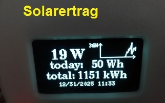 Christoph db1uq K. schrieb: > Lu schrieb: >> Solarertrag > > Ertrag in Watt? > Drunter stehen Wh, das scheint mir eher richtig. Bedarf der dargestellte Displayinhalt wirklich einer näheren Erläuterung? Ok: Die am 31.12.2025 um 11:33Uhr von den Modulen gelieferte Leistung betrug 19Watt. Die an diesem Tag bis um 11:33Uhr erzeugte Energiemenge lag bei 50Wh. Die gesamte Energiemenge seit Inbetriebnahme des Ladereglers (oder worum auch immer es sich bei dem fotografierten Gerät handelt) 1151kWh.