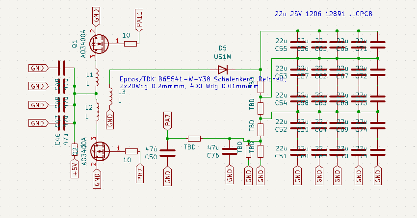 So Ihr Lieben, so siehts erstmals aus. Als Schalenkern hab ich den ausgewählt https://www.reichelt.de/de/de/shop/produkt/ferritkernsatz_4_9_h_material_t38-245942 für schlanke dreineunzig. Für das primäre Ampere benötige ich 0.2mm^2 Draht, sekundär 20mal weniger 0.01mm^2. Der Wickelraum ist ca. 5.6*2.4mm^2. Bei N*0.2+10*N*0.01 = 5.6*2.4 kommt ungefähr N=40 raus. In dem design sind so wenige Fehler dass man die nachher wahrscheinlich noch ausbügeln kann . Ich betreibe ein wunderbares Ultraschall Anemometer. Die Geber werden von Würth Trafos mit 80V versorgt. Die haben wahrscheinlich einen Goldkern, sonst läßt sich der Preis nicht erklären. Mit den frischen 100V steuere ich die direkt ohne Trafo an. Vielen Dank. Cheers Detlef