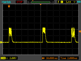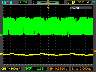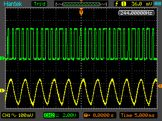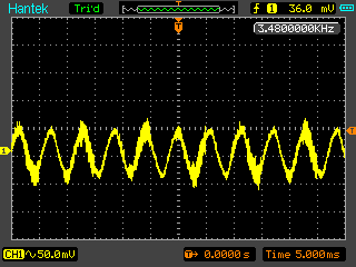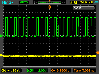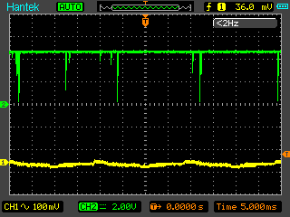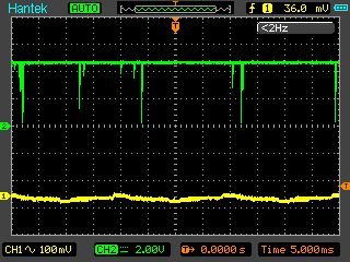 Günter L. schrieb: > Der Tondecoder erwartet warscheinlich eine saubere stabile > Frequenz. Der soll selektiv eine ganz bestimmte Frequenz > detektieren. Ich bin momentan -wie beschrieben- in der Testphase. Die Eingangsfrequenz ist sauber, da vom Signalgenerator erzeugt. ich hänge nochmals ein Bild an, das Eingang und Ausgang über zwei Kanäle zeigt. Der Decoder macht momentan nicht, was er nach Datenblatt soll. Wie das mit dem echten Signal dann tut, werde ich sehen. Zunächst macht es aber keinen Sinn, produktiv zu testen, wenn das unter Idealbedingungen schon mal nicht tut. Ich habe jetzt nochmals alle Trennstege der Platine saubergekratzt und mit Isopropanol die Flussmittelrückstände weggewaschen, um Gustavs Hinweis auszuschliessen.