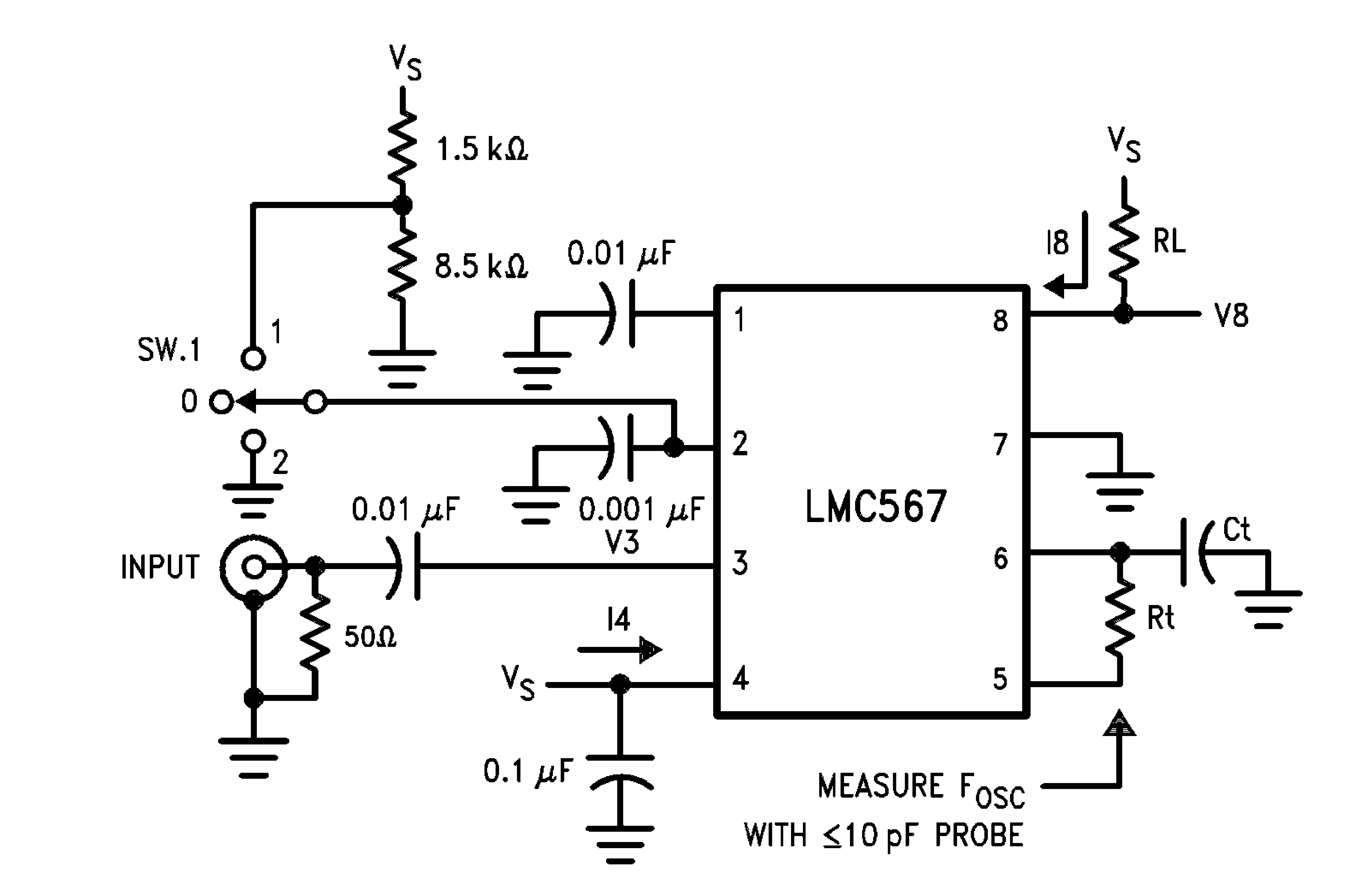 Die Prozentzahl muss hier tatsächlich als 10 und nicht als 0,1 eingegeben werden, da sonst der Wert ins astronomische steigt. Mach ich hier etwas falsch? Ich bin ja zufrieden, dass ich mit den zunächst ermittelten Werten eine stabile Schaltung bekommen habe. Aber warum weichen die anderen Werte so stark ab? Ein weitere Punkt, der mir beim Durchsehen der Datenblätter auffällt: In den Datenblättern zum LMC567 gibt es eigentlich keine saubere Angabe, wie der Kondensator an Pin 1 (meist C3 genannt) dimensioniert werden soll. Es gibt nur die Hinweise, wie eine LM567-Schaltung auf den LMC angepasst werden soll: > 1. Oscillator timing capacitor Ct must be halved to double the oscillator > frequency relative to the input frequency Das ist auch nur sehr grob, da die LM-Varianten Faktoren von 1,1 auf den Divisor anwenden, der LMC jedoch den Faktor 1,4 (respektive 2,8, wenn verdoppelt) > Filter capacitors C1 and C2 must be reduced by a factor of 8 > to maintain the same filter time constants. Daraus lässt sich in jedem Fall ableiten, dass der Kondensator an Pin1 mindestens doppelt so groß, als derjenige an Pin 2 sein soll. Das ist ja die Bemessung bei den LM-Varianten. Kann hier jemand noch ein wenig Licht in die Sache bringen, ich würde den Artikel über die LM/LMC Bausteine gerne mit Fakten und nicht mit Vermutungen erweitern. Edit: Formel korrigiert