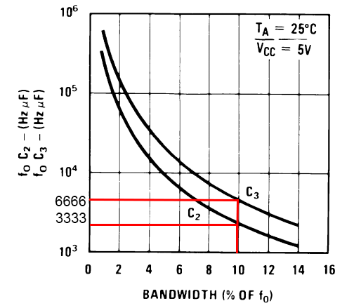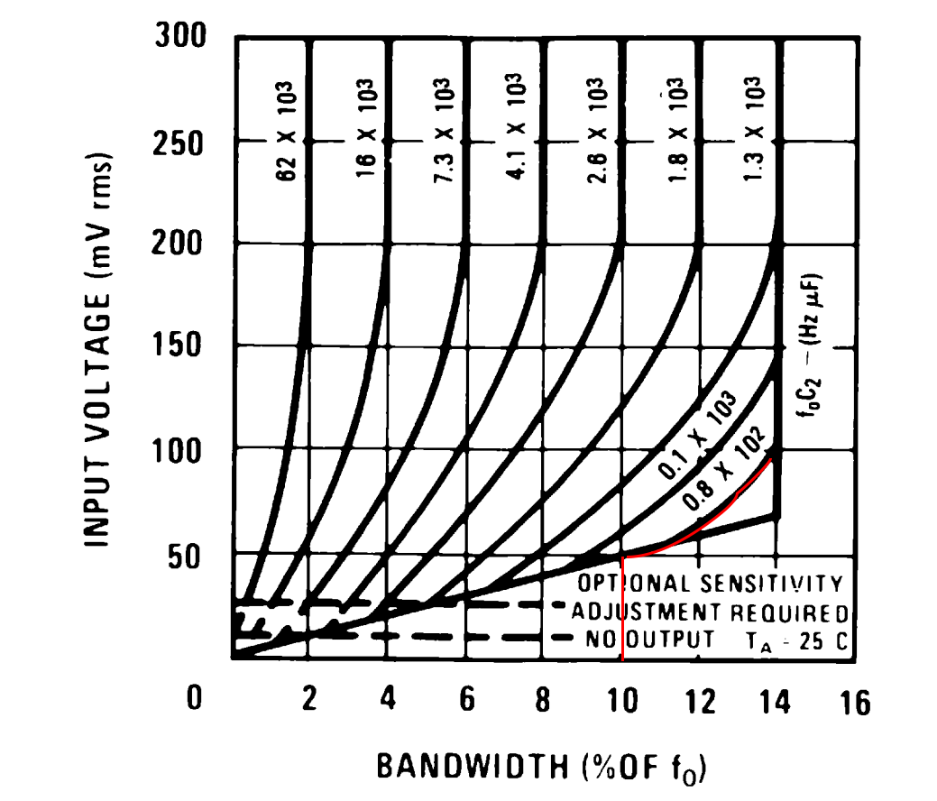So, jetzt den Oszillatorschwingkreis mit einem 462,3nF Kondensator an Pin 6 und einem 10k-Poti mit 4,7k Reihenwiderstand bestückt. Den Eingang, Pin3, aus Masse gelegt, dann schwingt der Oszillator stabil mit 175 Hz, wenn der Gesamtwiderstand zwischen Pin 5 und Pin 6 13,12kΩ beträgt. Mit offenem Eingang schwingt der Oszillator bei unveränderten Werten mit 182.2Hz. Wenn ich mit den Werten nun rückrechne, komme ich auf einen Faktor von 0,94 im Falle von 175 Hz, bzw auf 0,9 im Falle von 182,2Hz. Da passt leider keines der gefundenen Datenblätter. Jetzt mal weitermachen, es geht um die beiden anderen Kondensatoren. Hier habe ich mich an der angehangenen Grafik, die es so in mehreren der Datenblätter gibt, gehalten. Im Datenblatt des LM567 ist es das Diagramm 7.7. Rückgerechnet ergeben sich dann rechnerisch für den Wert 3333 19µF und für 6666 dann 38µF. Also einen 22µ und einen 47µ bestückt. Test mit 100mV Pegel auf einen 1µ Koppelkondensator, funktioniert wunderbar. Pegel auf 50mV heruntergedreht, das Signal wird dabei unsauber, das Oszi kann keine Frequenz mehr messen, aber der Chip regiert nach wie vor sauber, indem der Ausgang low geht, und sauber low bleibt, egal ob man mir der Hand drüber geht. Also genau das, was ich will. Leider will ich das mit weniger als 5V :-(. Aber man lernt ja dabei. So nun geht es in den Datenblättern weiter. Beim LM567 und bei einigen der Derivaten, gibt es das Diagramm 7.5. Wenn ich hier bei 10% Bandbreite einsteige, komme ich auf die im Anhang hier rot markierten Kurve, die den Wert 80 repräsentiert. Hier zurückgerechnet komme ich auf 457 nF, also 1/40 des zuvor ermittelten Wertes. Warum? In Kapitel 9.4.1 findet sich eine weitere Formel, die einen Bezug zwischen Bandbreite, Eingangsspannung, Frequenz und Kapazität herstellt