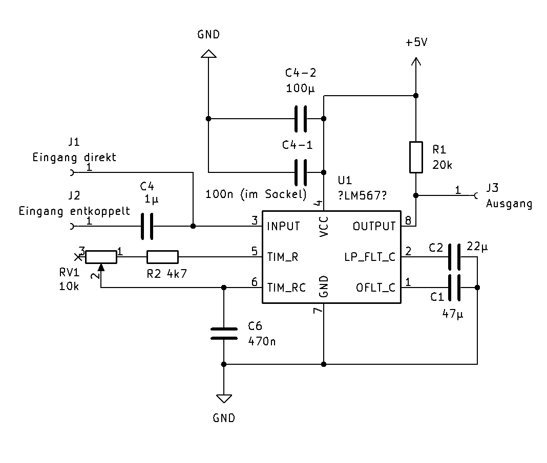So, mittlerweile noch einige Versuche unternommen. Mit meiner originalen Widerstandschaltung, 47k +100k Poti in Reihe, konnte ich den Schwingkreis auf 350Hz einstellen. Jedoch nach wie vor die Rechteck-Pulse am Ausgang, sobald mehr als 65-70Hz am Eingang anliegen. Diese ändern sich etwas im Tastverhältnis, wenn die Frequenz nach oben geht. Jetzt habe ich mich mal nur auf den Schwingkreis konzentriert und das Ganze nochmal auf dem Steckbrett zusammengebaut. Ohne Eingangssignal auch hier 490Hz, wenn zuvor der Widerstand auf 100k eingestellt wurde. Wenn ich die beiden Kondensatoren an Pin1 und Pin2 weglasse, schwingt das Ganze mit 550HZ. War nur mal ein Versuch, inwieweit diese auf den Oszillatorschwingkreis wirken. Jedoch, egal ob ich meine initialen 0,001µ für Pin2 und 0,01µ für Pin2 oder aber die Vorschläge 10µ an Pin2 und 220n an Pin1, oder auch 1µ and Pin2 bleibt der Oszillator bei 490Hz. Jetzt ist mir, was die Kapazitäten betrifft, nur noch unklar, wie genau ich den Kondensator an Pin1 bestimmen kann. Der an Pin 2 lässt sich, wie mir schön von Wolf17 erklärt, über die Diagramme 4 und 2 eingrenzen. Für den Kondensator an Pin1 wird nur die Funktion in Kapitel 9.3.4 erklärt, sowie die Tatsache, dass Pin 1 zusätzlich über einen Widerstand nach GND oder Vcc verbunden werden kann, umd die Eingangsempfindlichkeit zu erhöhen oder zu reduzieren. Ein Hinweis aus dem Datenblatt zum NE567 (https://www.uni-ulm.de/fileadmin/website_uni_ulm/wwe/Datenblaetter/IC-mixed/NE567_tone_decoder.pdf) lässt mich hier noch an den Werten zweifeln. Dort wird, wie bereits zuvor zitiert, Folgendes beschrieben (C3 ist Pin 1, C2 ist Pin2): > The value of C3 is generally non-critical. C3 sets the band edge > of a low-pass filter which attenuates frequencies outside the > detection band to eliminate spurious outputs. If C3 is too small, > frequencies just outside the detection band will switch the output > stage on and off at the beat frequency, or the output may pulse > on and off during the turn-on transient. If C3 is too large, turn-on > and turn-off of the output stage will be delayed until the voltage > on C3 passes the threshold voltage. > (Such delay may be desirable to avoid spurious outputs due to transient > frequencies.) A typical minimum value for C3 is 2C2. Der letzte Satz empfiehlt an Pin1 die doppelte Kapazität wie an Pin2 zu verwenden. Da in zahlreichen Artikeln über den Ersatz des LM567/NE567 durch einen LMC567 einfach nur Faktoren auf die Werte empfohlen werden, stelle ich mir hier die Frage, ob diese Regel dann nicht auch beim LMC gilt? Ich bin jetzt allerdings mit meinem Latein ziemlich am Ende. Wenn jemand Lust hat, würde ich einen der Brüder meines Chips durchaus auch an einen Interessierten verschicken, wenn jemand sich das näher ansehen will.