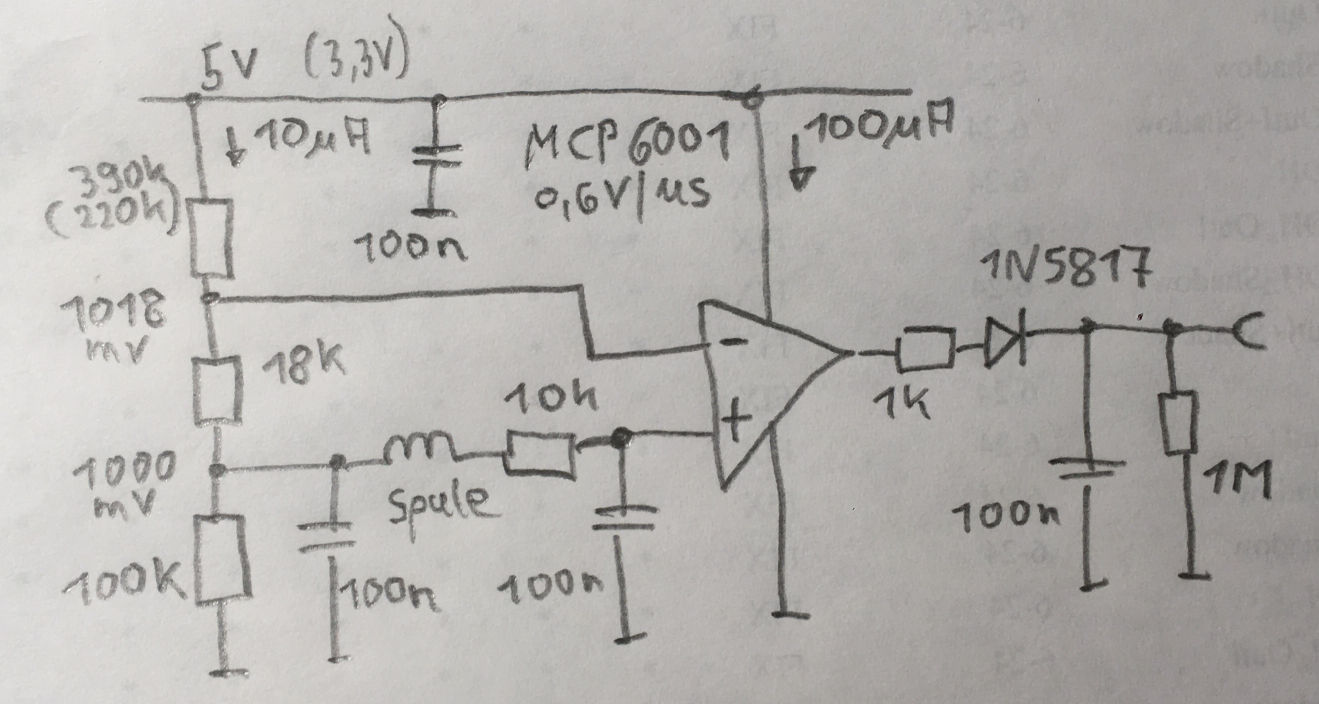 Nick schrieb: > Formel nennen, wie ich von Anzahl Wicklungen und Durchmesser > auf die Induktivität komme Google? https://wetec.vrok.de/rechner/cspule.htm 250Wdg 0,1mm werden 100mV liefern. Danach Verstärkerstufen aus Invertern (wie 74C04, CD4049, <1µA). Mit zwei Stufen je 3 Inverter (Bild 6) sollte der Spulenpegel zum MCU triggern reichen. https://shrubbery.net/~heas/willem/PDF/NSC/AN/AN-88.pdf Am besten wären ungepufferte Inverter.